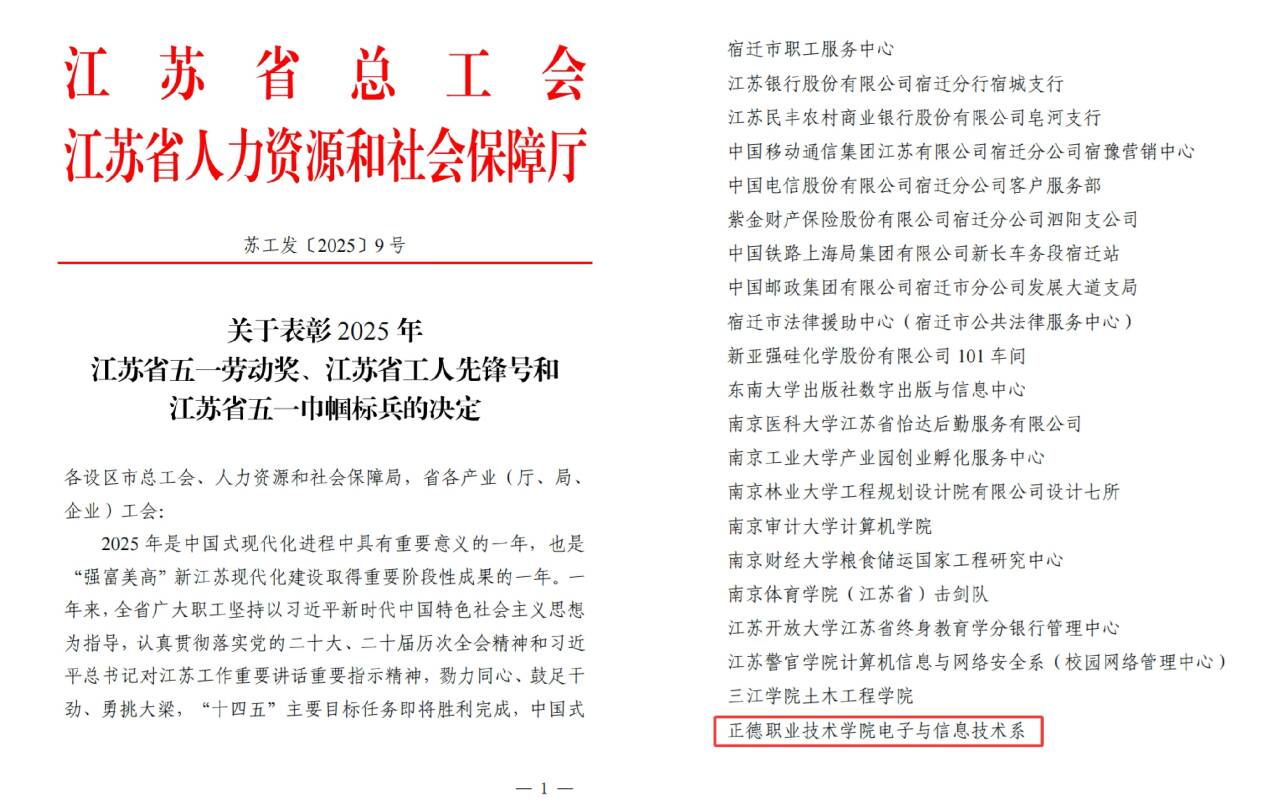 为表彰2025年度在全省各行各业涌现出的先进集体与个人,进一步弘扬劳模精神、劳动精神、工匠精神,江苏省总工会、江苏省人力资源和社会保障厅于12月19日发布《关于表彰2025年江苏省五一劳动奖、江苏省工人先锋号和江苏省五一巾帼标兵的决定》,麻豆传媒 电子与信息技术系成功获评江苏省“工人先锋号”荣誉称号。