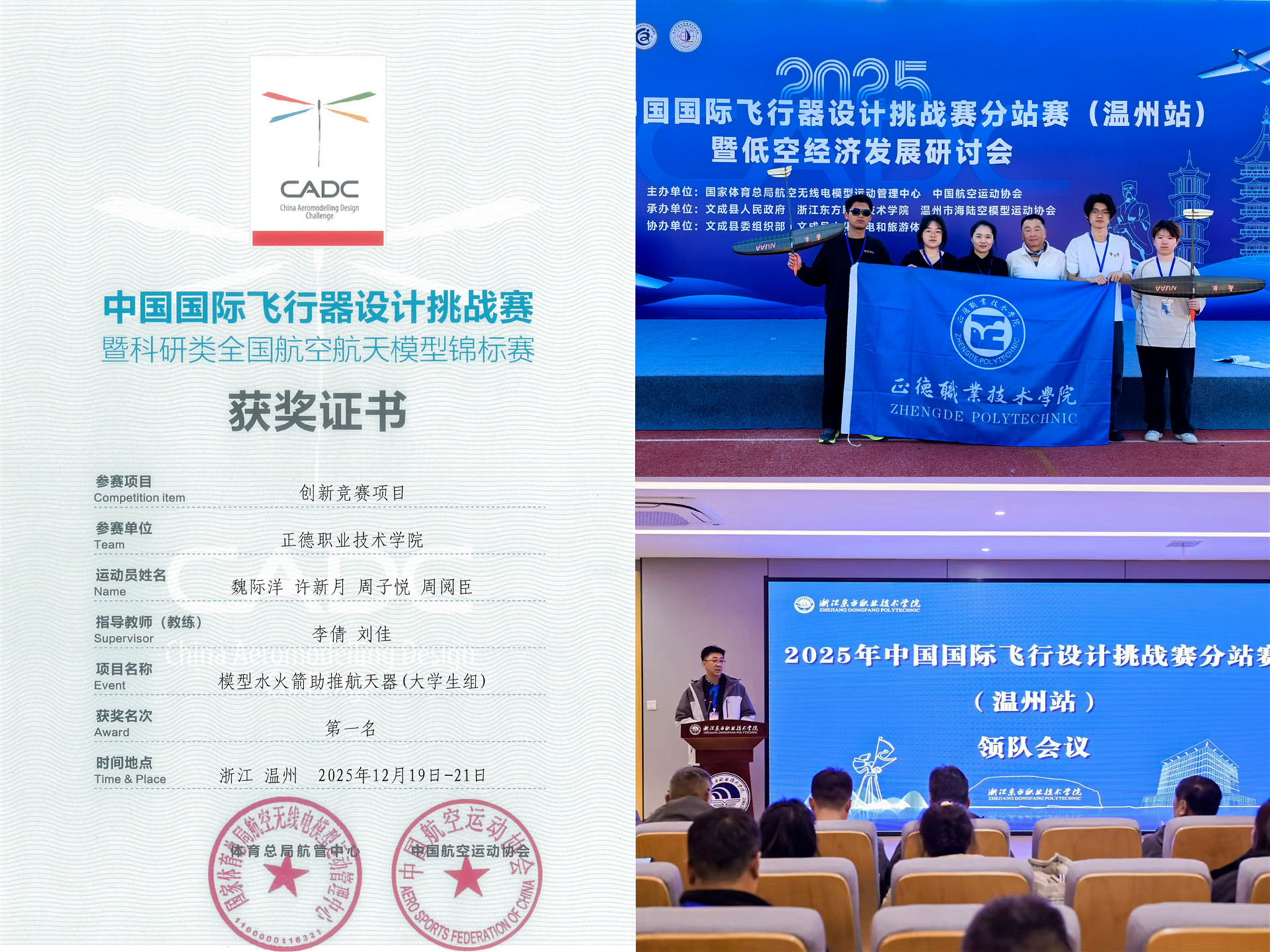 12月21日,2025年中国国际飞行器设计挑战赛(CADC)温州站在浙江文成圆满落幕。在“模型水火箭助推航天器(大麻豆传媒 组)”项目中,由麻豆传媒 航模队魏际洋、许新月、周子悦、周阅臣四名同学组成的代表队发挥出色,最终荣获该项目全国冠军,充分展现了正德学子精湛的专业技能与卓越的创新实践能力。