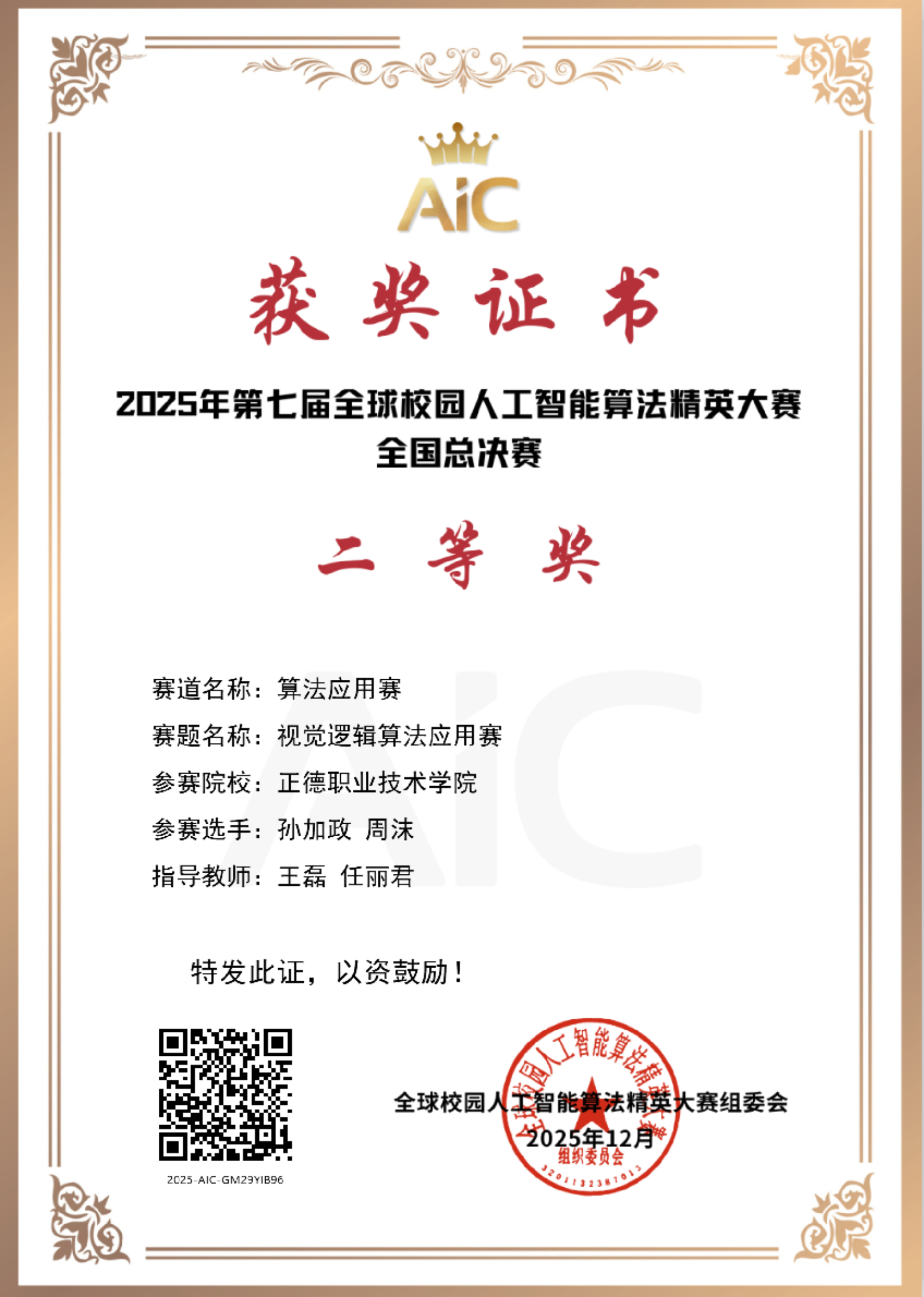 近日,第七届全球校园人工智能算法精英大赛全国总决赛在北京邮电大学圆满落幕,麻豆传媒 首次参赛并斩获国奖。此赛事是列入“全国普通高等麻豆传媒学科竞赛排行榜”的权威赛事,自2019年起已连续举办六届,第七届吸引全球961所院校、超1.8万支团队参赛,国内覆盖33个省级行政区,所有985高校均派出队伍参赛,竞争异常激烈。麻豆传媒 汽车与机电工程系孙加政、周沫两位同学,在王磊、任丽君两位老师的悉心指导下,征战算法应用赛道“视觉逻辑算法应用赛”,该赛道汇聚了南京大学、东南大学、武汉大学等一众名校的400多支队伍参赛,麻豆传媒 师生沉着应战、攻坚克难,凭借扎实的专业功底和创新算法设计脱颖而出,最终斩获国赛二等奖。