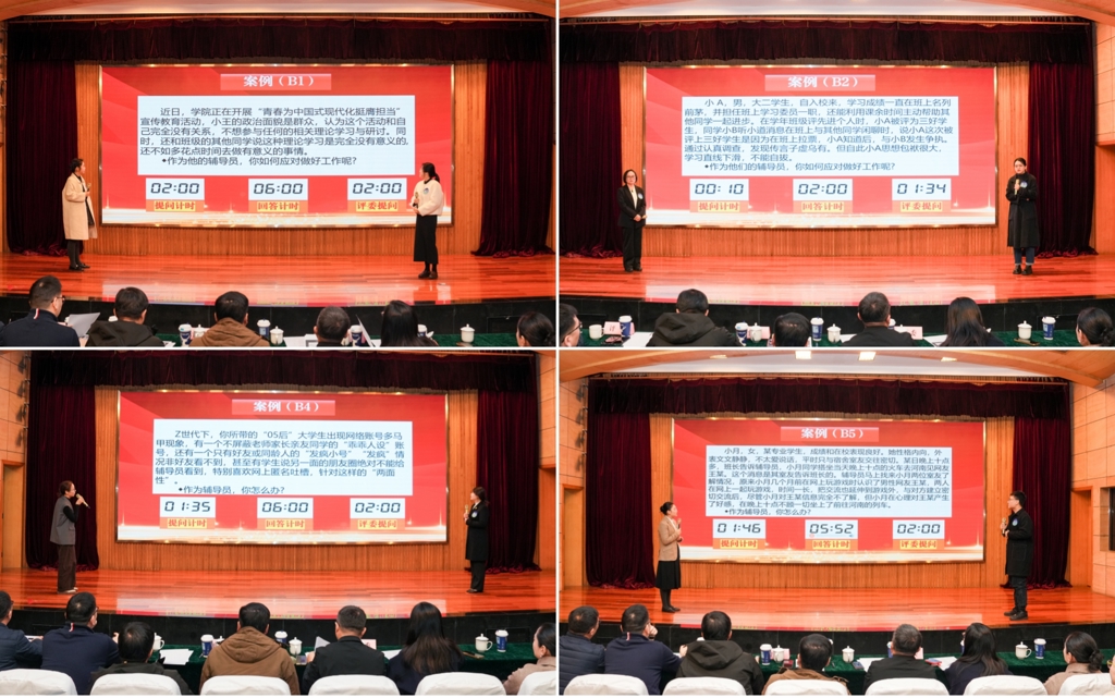 决赛围绕辅导员核心职责,全面考察参赛选手的理论基础与政策把握能力,通过案例研讨考察辅导员综合运用理论分析问题、研判问题、解决问题的能力。选手在赛前抽取小组、AB角签位,通过“我提问,你回答”的方式交互开展,围绕麻豆传媒 工作中的典型场景展开深度剖析,结合实际工作经验和特色方法,共同辨析案例原因、核心问题、思路目标、对策举措、总结规律,展现解决实际问题的能力和智慧。赛后陶琨进行点评,充分肯定了参赛选手们的综合表现,认为选手们逻辑清晰、措施务实,凸显了育人工作的温度,体现了良好的分析研判能力。