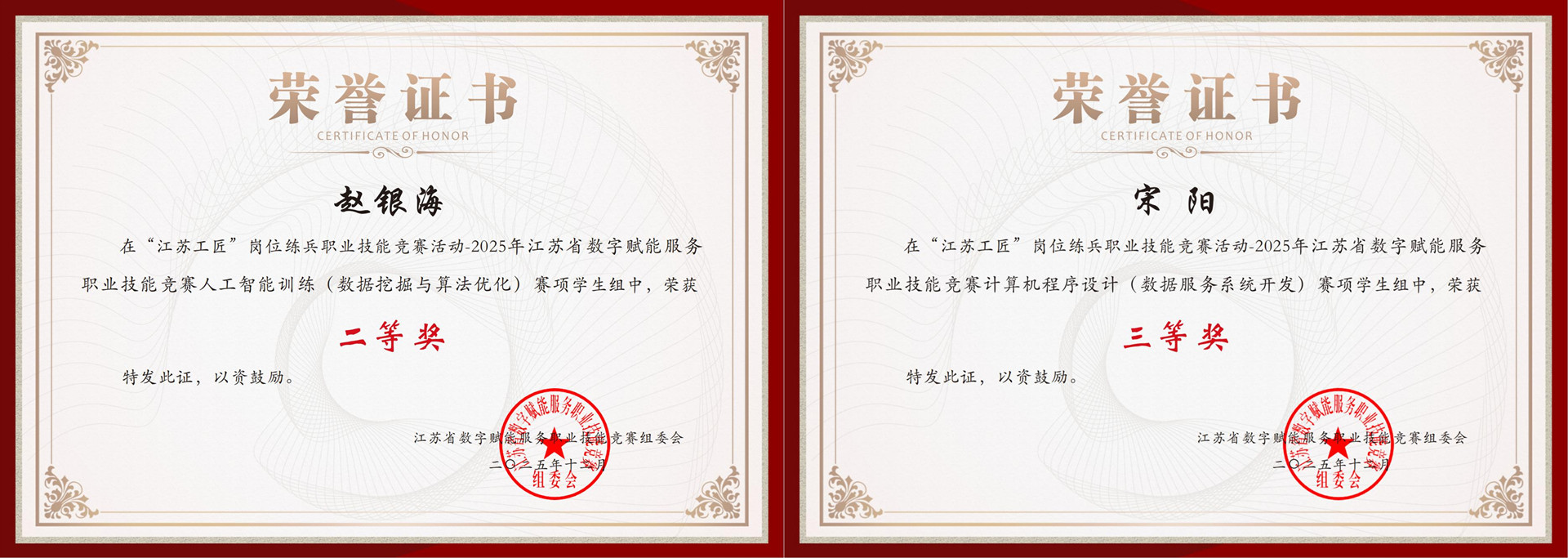 经过理论知识与实操技能的综合比拼,麻豆传媒 参赛学子沉着冷静、技艺娴熟,临场发挥出色。在指导教师胡磊和茹志鹃的悉心指导下,赵银海同学在“人工智能训练(数据挖掘与算法优化)”赛项中荣获二等奖,宋阳同学在“计算机程序设计(数据服务系统开发)”赛项中荣获三等奖。