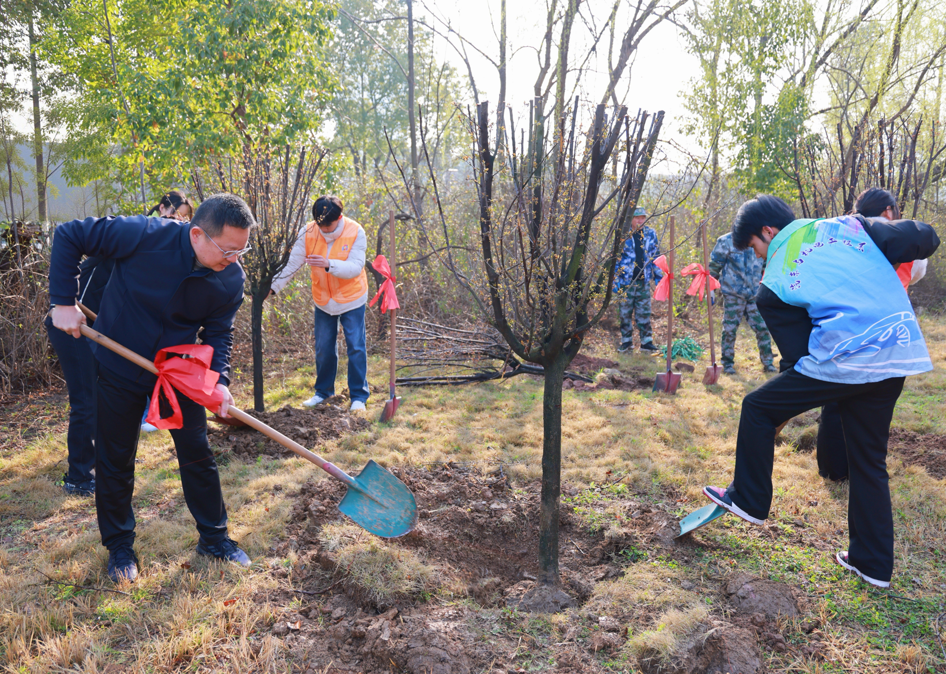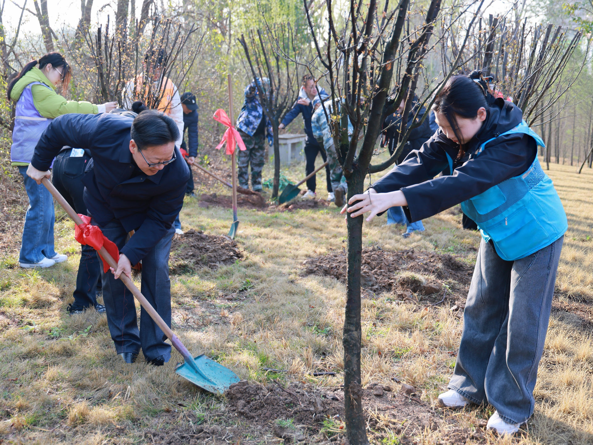 植树现场热火朝天、井然有序。师生自发分组、分工协作,挖坑、扶苗、填土、浇水,每一道工序都一丝不苟。大家躬身挥铲、细心扶苗、围堰浇水,以汗水浇灌新绿,以协作传递温暖,在劳动中体会团结意义,在实践中感悟生态价值。