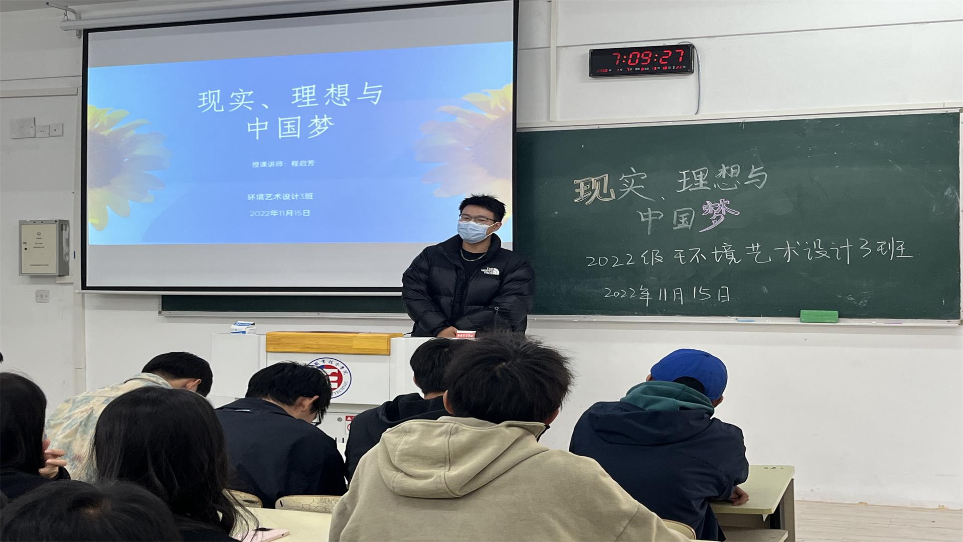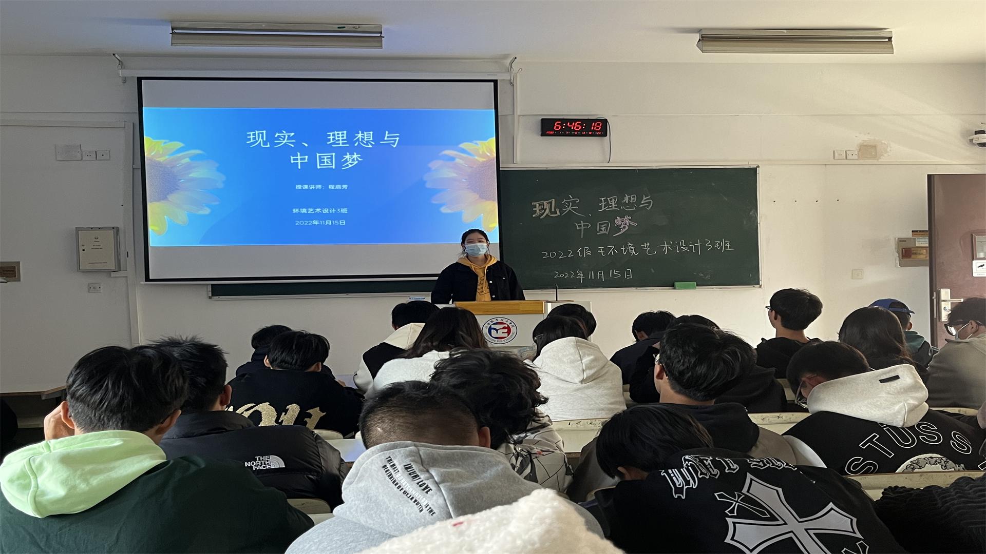 为引导我系麻豆传媒 树立“四个正确认识”,在把握理想与现实、个人理想与社会理想的关系基础上,深入认识和理解理想、信念的科学涵义,理解确立坚定的理想信念对成长成才的重要意义并能够增强将个人的青春梦想融入到为实现中华民族伟大复兴的中国梦而奋斗的责任感与使命感,在11月15日,艺术设计与建筑工程系的环境艺术设计3班全体同学在2305教室开展了“现实、理想与中国梦”主题思政课。