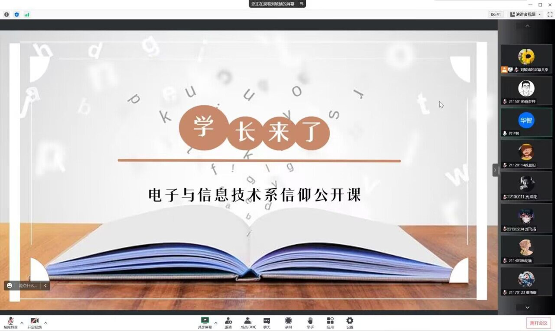 本次信仰公开课在思想引领上给电信系学子指明了方向、在个人提升上提供了途径,为电子与信息技术系培养信仰坚定、思想先进、能力突出、素质优良的新时代青年大麻豆传媒 打下了基础。奋进新征程,勇担新使命,希望同学们深入学习领会党的二十大精神,牢记习近平总书记对青年人的嘱托,以身边的优秀校友为榜样,踔厉奋发,勇毅前行,为中国特色社会主义建设贡献青春和力量。