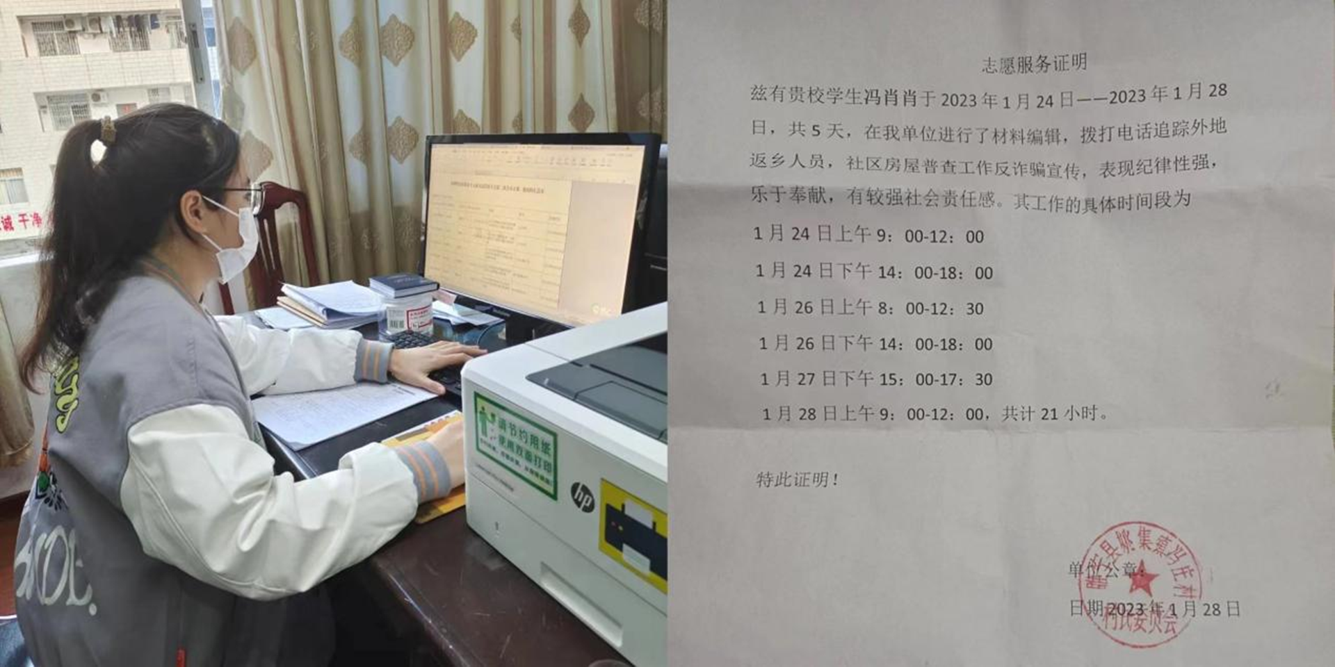 冯肖肖同学报名成为了一名村委会社会实践志愿者。陌生的工作环境挡不住她炽热的激情,在同事们的悉心指导下,冯肖肖很快便掌握了工作流程,她的付出和努力得到了单位的肯定。冯肖肖在报告中写到:”经过村委会的社会实践,我深刻感受到将理论转化为实践的不易,我也更加明白,只有在不断突破自我的实践中充实理论知识,才能够有能力以实际行动为家乡建设贡献自己的力量。以星火之名燃青春之光,是我们青年一代的使命。此次参加社会实践活动,让我接触到了许多以前不曾接触的内容,有助于我们这些在校生更新原有观念,吸收新的思想和知识。这是我走向社会的必经之路,我会好好去感悟,走好接下来的每一步。”