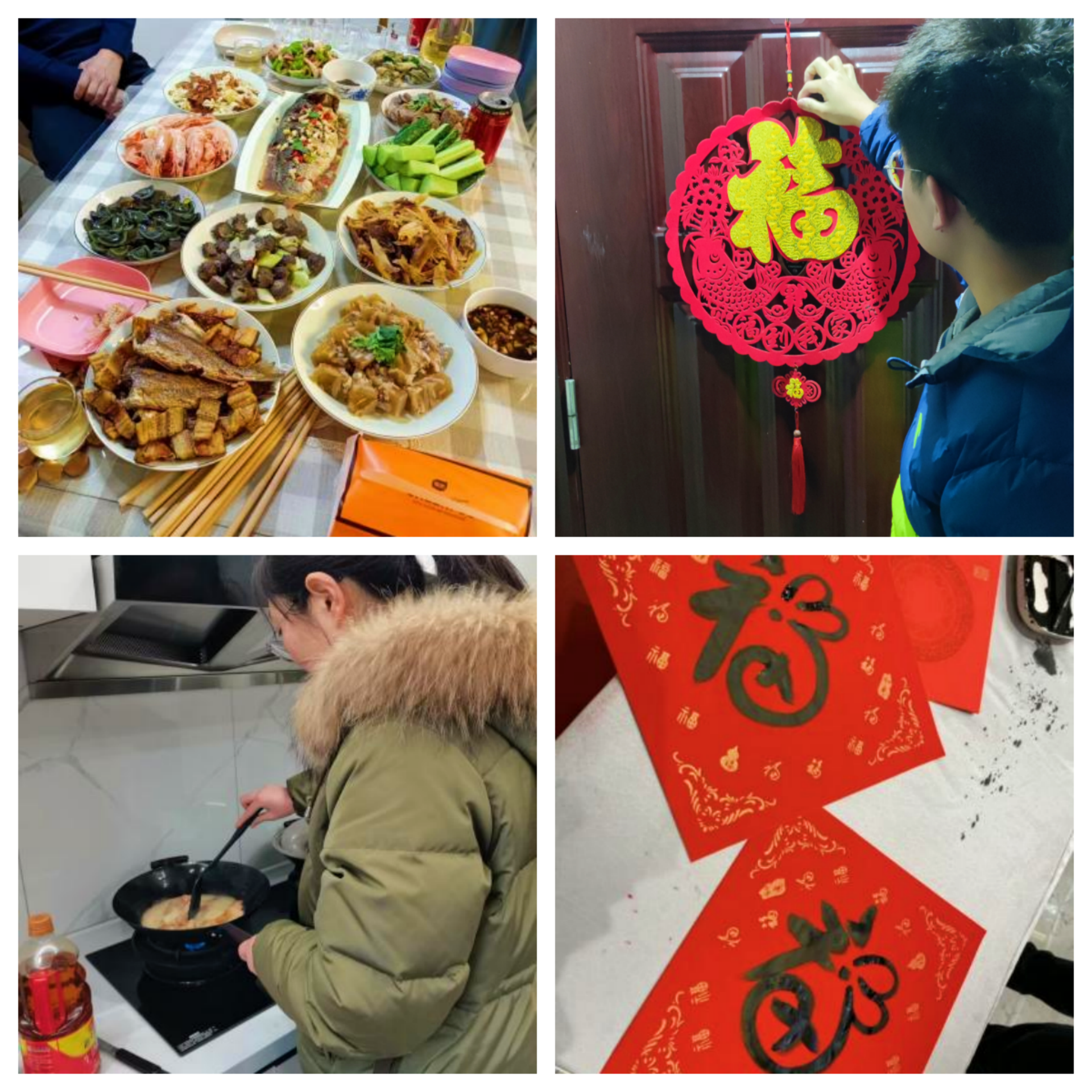 寒假春节期间,同学们通过贴春联、写“福”字、做团圆饭等活动,在实践过程中传承优良美德,积极参与家庭活动,用心体验优秀传统文化。优秀的传统文化对我们树立正确的人生观具有重大意义,有利于提高我们的思想素质,增强了凝聚力,激发了爱国主义的思想。