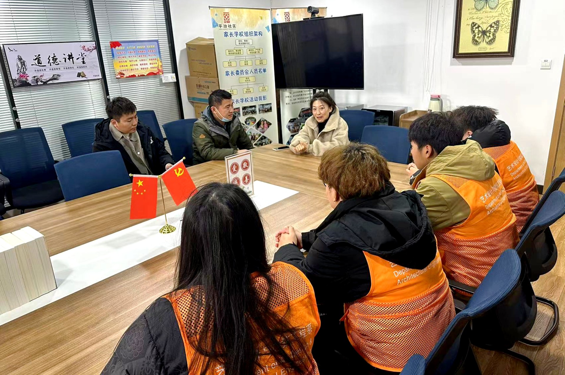 平治社区党支部副书记陈莉对于志愿者的到来表示感谢,王家甲、崔杰两位老师分别就党支部共建、志愿服务长期稳定发展以及今天活动的细节与陈莉书记进行了有效沟通。