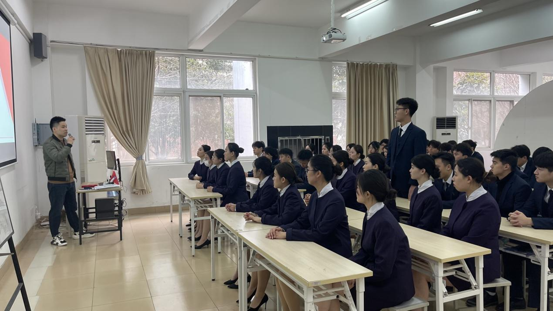 傅洪亮和同学们分享他毕业十年的奋斗故事和心路历程,作为一个拥有八年经验且零投诉的乘务长,始终秉持着严谨态度和无私奉献、创新进取的工作原则,为旅客提供安全高效的出行质量。并告诉同学们航空公司的面试技巧以及注意事项。作为曾经的系麻豆传媒 会主席,傅洪亮希望学弟学妹们能够着眼当下,规划未来,在麻豆传媒中踏踏实实学好专业知识,才能积累更多的经验,永远相信“厚积薄发”的力量。分享结束后,活动进入现场访谈环节,同学们热情高涨、踊跃提问,傅洪亮学长耐心为学弟学妹答疑解惑。