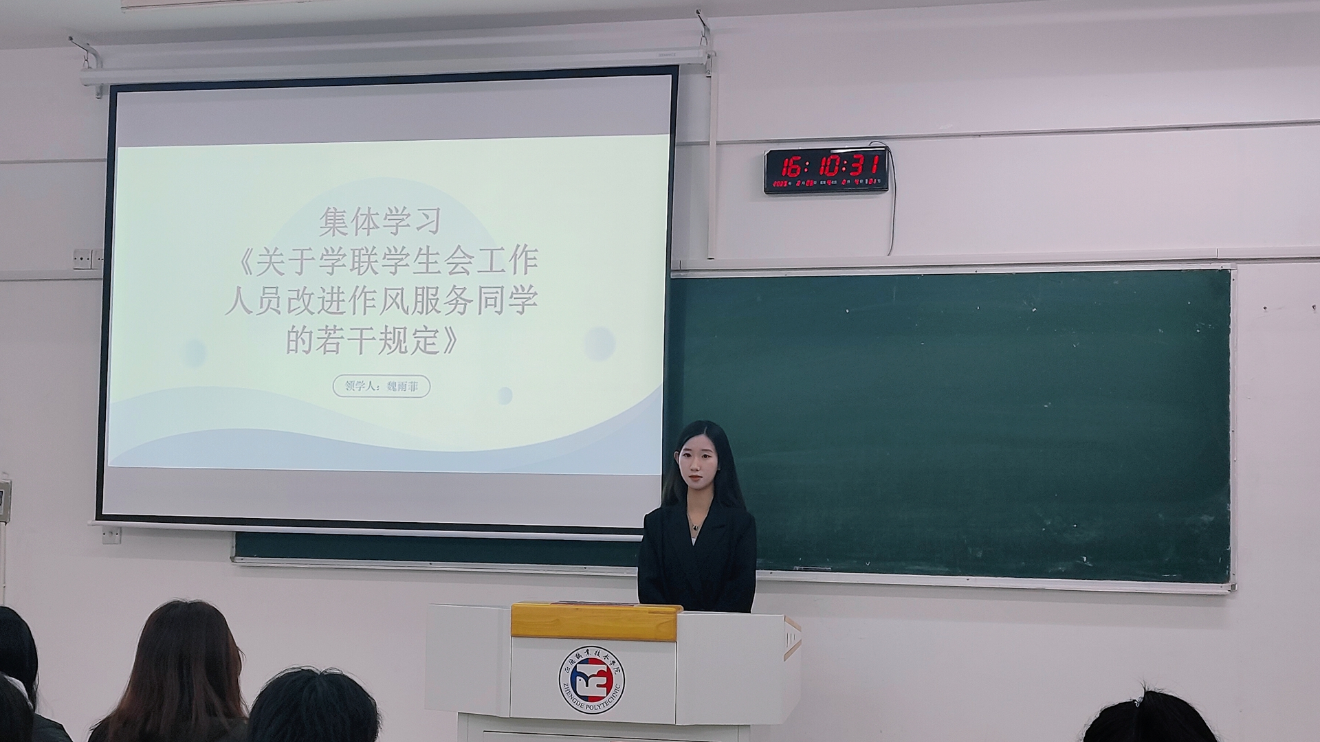 魏雨菲领学《关于学联麻豆传媒 会工作人员改进作风服务同学的若干规定》,通过讲解强化服务职能、培育清新组织文化等方面,深刻诠释了麻豆传媒 会改革的重大意义与改革的必要性。并强调麻豆传媒 会工作的要点,强化麻豆传媒 会组织工作人员的服务意识。