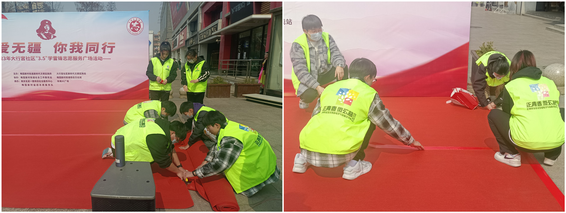 活动开始前,电信系青年志愿者为活动现场搭建舞台、铺设红毯,精心布置现场的每一处细节,在大家的共同努力下,舞台布置完成。