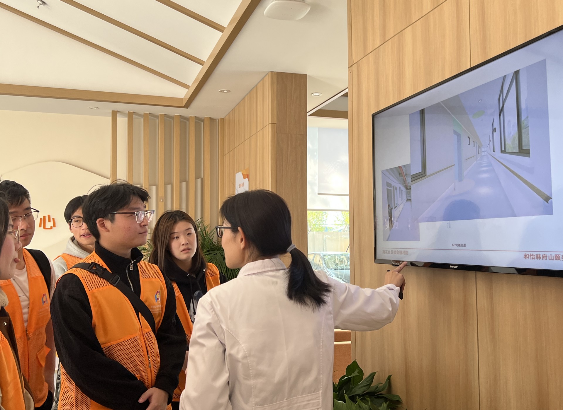 在姜院长的带领下,志愿者们对养老院内进行了参观。姜院长介绍到,和怡韩府山颐养中心不仅仅是人们所熟知的“养老院”,也是社会福利中心。志愿者们与老人聊天谈心,还协助工作人员派发晚餐,为行动不便的老人喂饭。切身的投入到关爱老人的行动中。