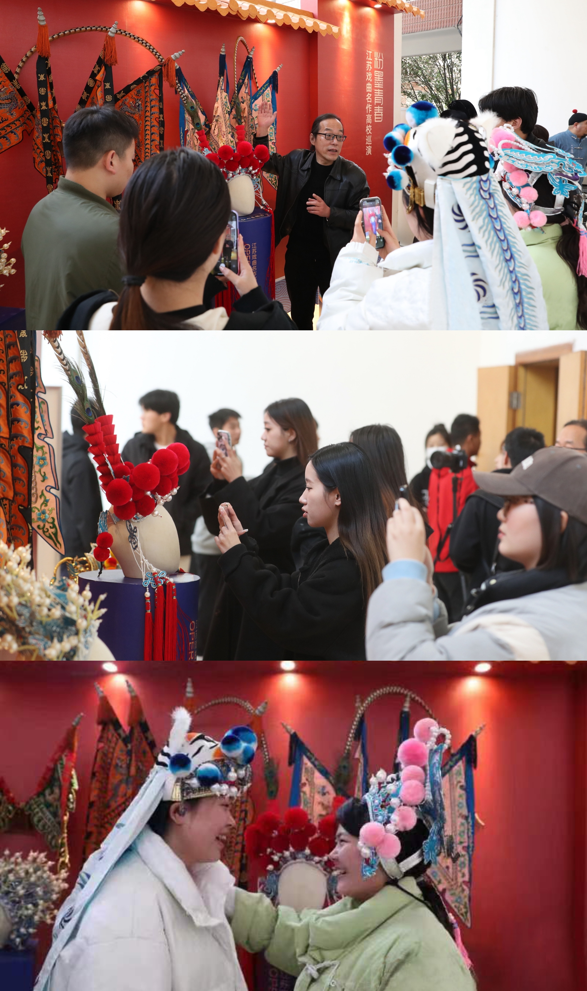 中国非物质文化遗产项目脸谱代表性传承人颜蕾老师精心布置了内容丰富的戏曲头饰展,并为前来观展的师生们细致科普了戏曲头饰及脸谱的相关知识,吸引了不少同学提前“打卡”以及拍照留念,体验非遗文化的魅力。