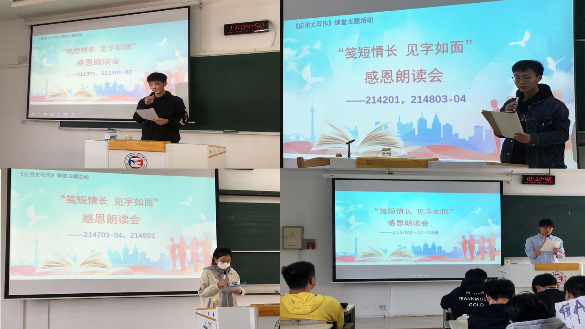 《诗经》云:“哀哀父母,生我劬劳。”母爱就象一首深情的歌,婉转悠扬。感恩是中华民族的传统美德。“三八国际妇女节”到来之际,公共教学部应用文写作老师在课上成功策划举办了“笺短情长,见字如面”感恩朗读会,电信系和艺建系21级7个专业共70多位同学参加了诵读会,怀着感恩的心,用朴素的文字和真挚的情感为自己的母亲送上诚挚的感谢和节日的祝福。