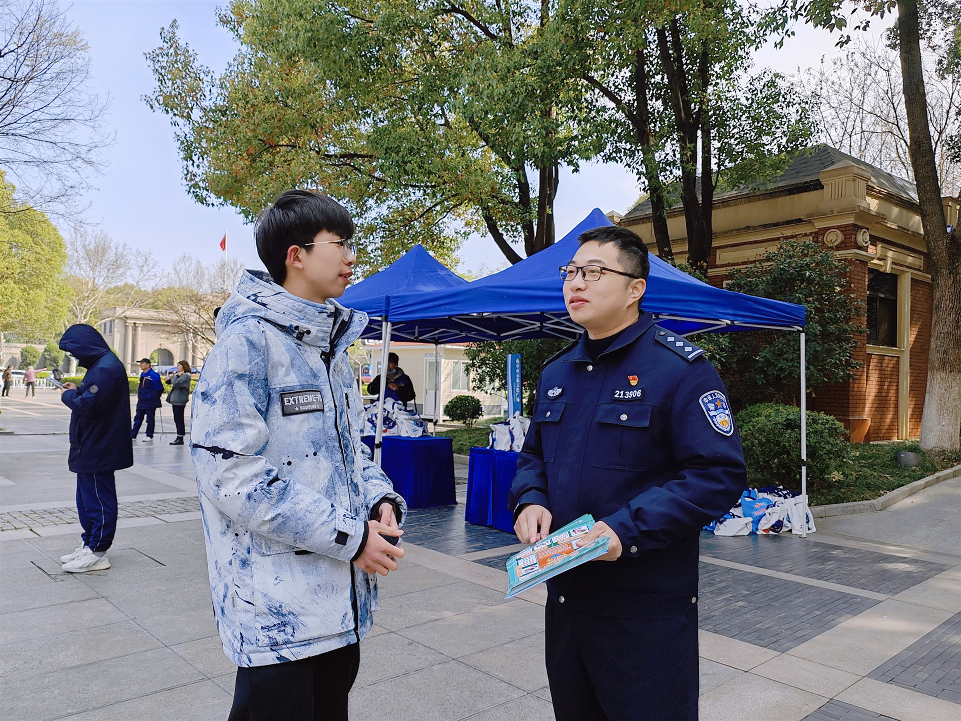 活动开始前,志愿者们就已经来到大行宫广场协助场地布置。反诈中心民警向志愿者简要解读了《反电诈法》的相关条例,并以辖区内的实际案件为例进行生动讲解,提醒居民不轻信、不刷单、不汇款,远离电信网络诈骗。