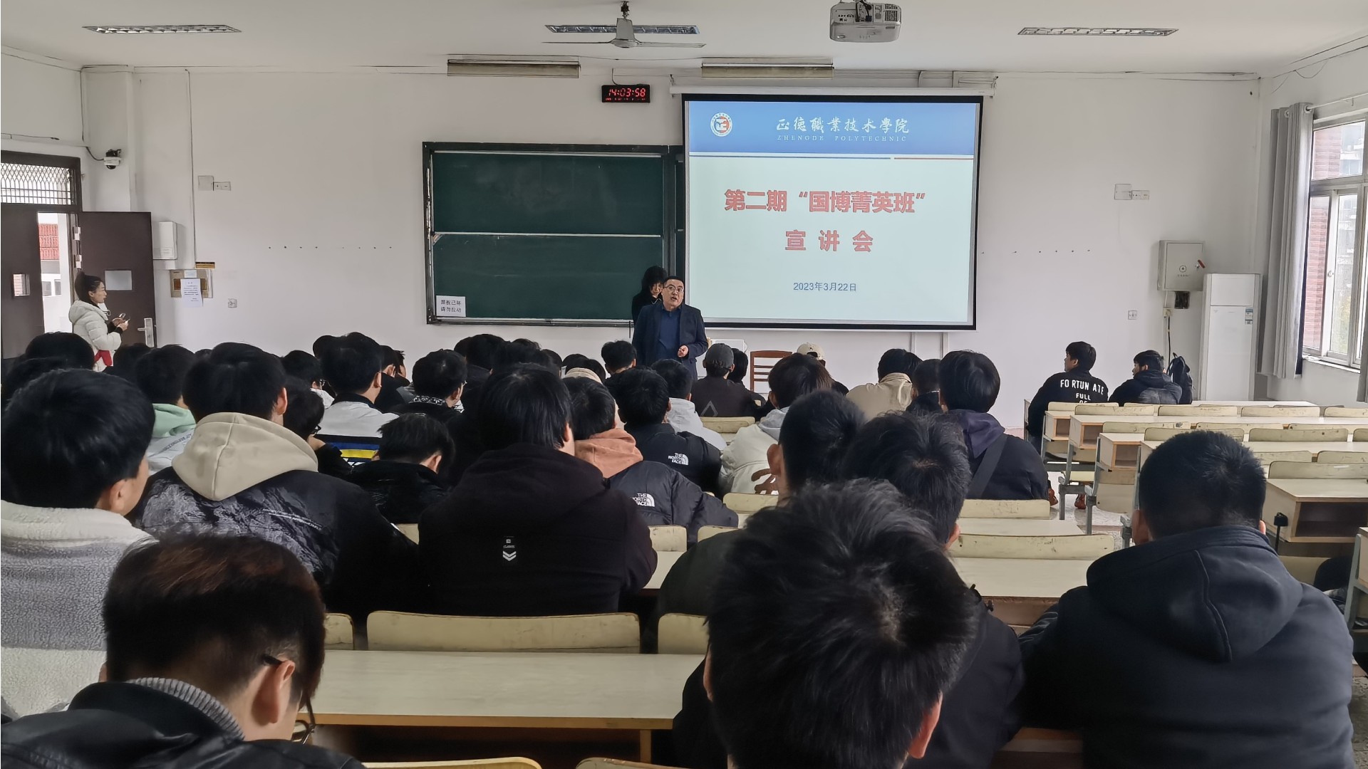 3月22日下午,第二期“国博”菁英班遴选面试活动在教学楼1103教室举行,南京国博电子股份有限公司人力资源部主管韦静担任主考,来自电子与信息技术系、汽车与机电工程系、民用航空系的九十位同学报名参加遴选,教务处副处长、校企合作办主任陆松主持活动。