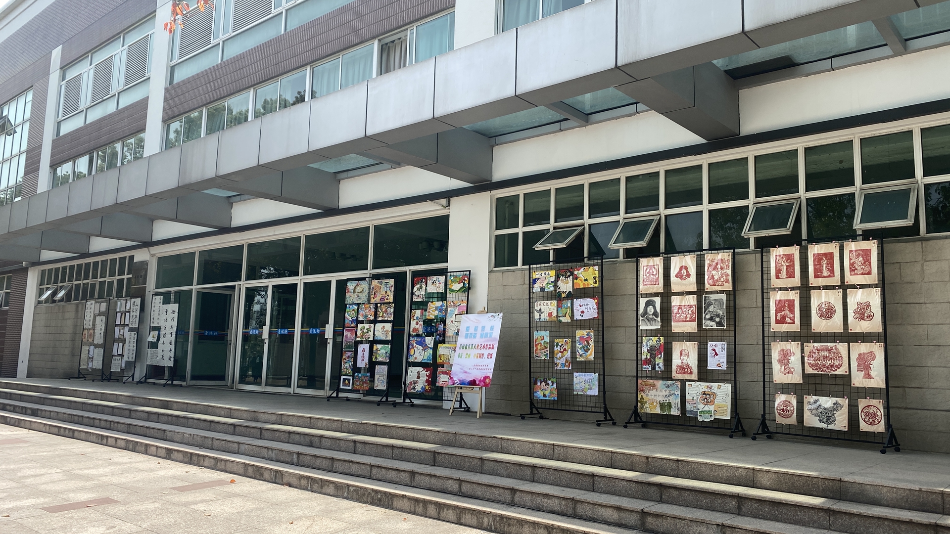 在运动馆前展示的作品引起同学们的驻足观看,三三两两在一幅幅画中徘徊,寻找自己的作品或欣赏他人的创作。