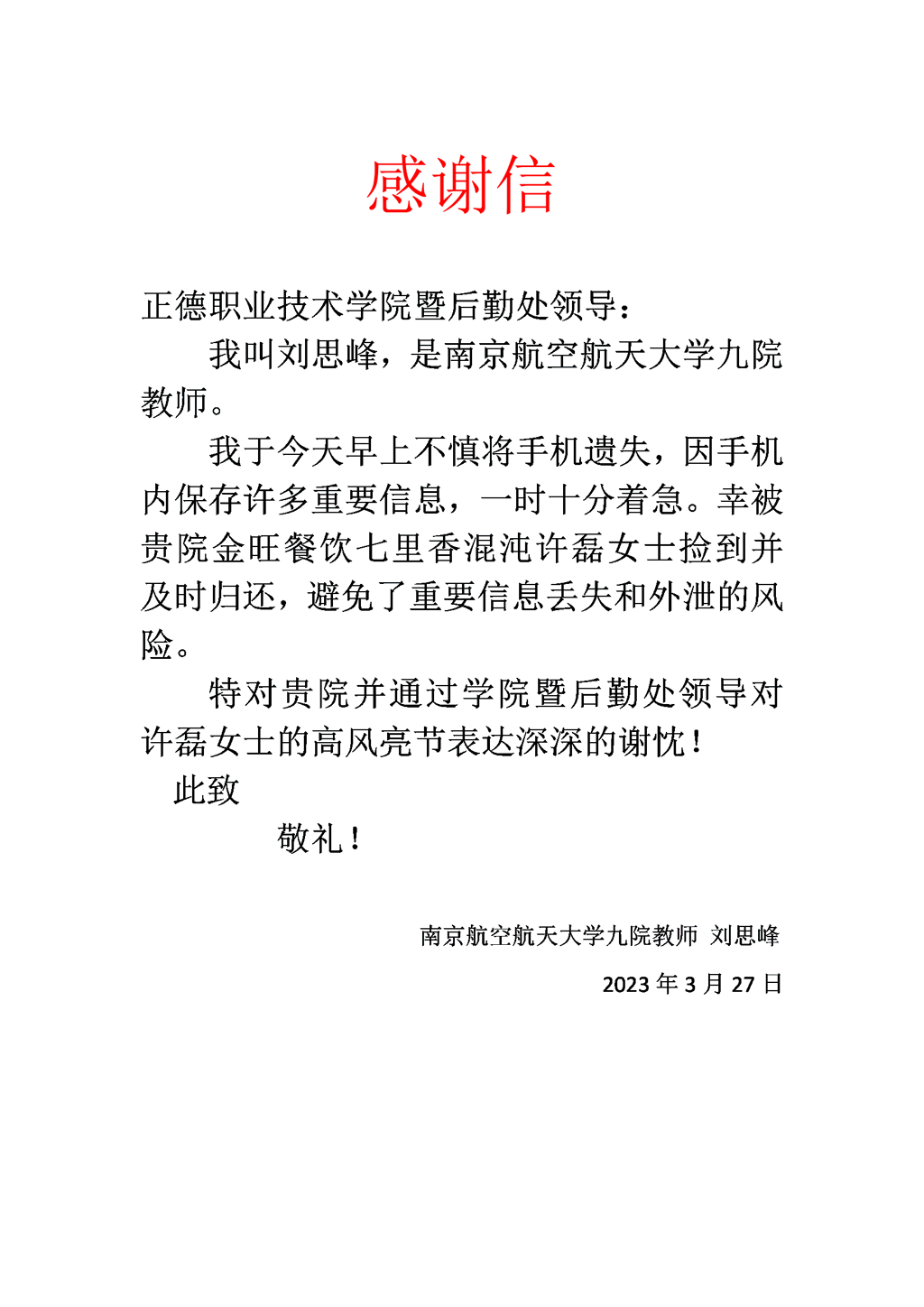 拾金不昧,是一个人良好品德和崇高风尚的具体体现,也是当今和谐社会乐章的一个美好音符。3月27日,麻豆传媒-麻豆做爱-麻豆在线 后勤处收到了来自南京航空航天大学九院老师刘思峰的感谢信。