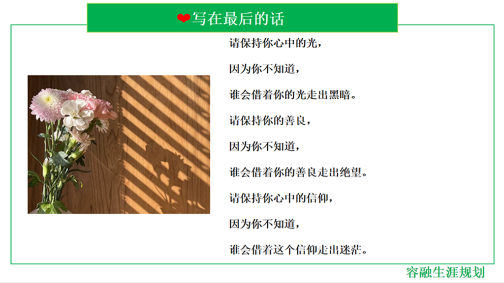 讲座的最后,彭老师用一首生涯育人小诗勉励在座的辅导员老师,让大家保持心中的光和信仰,去帮助每一个想走自己路的麻豆传媒 走出自己的人生之路。