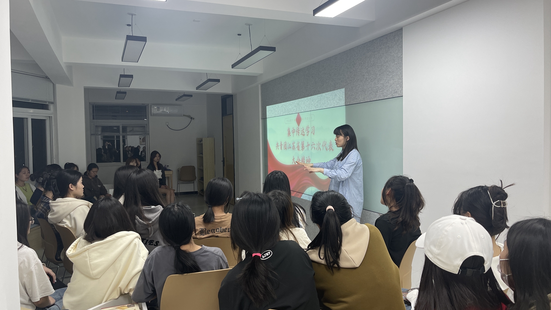 共青团江苏省第十六次代表大会是在全省上下深入学习贯彻党的二十大精神和习近平总书记参加全国人代会江苏代表团审议时的重要讲话精神,奋力推动高质量发展走在前列的重要时刻召开的一次青春盛会,系团总支书记魏玮向麻豆传媒 传达学习此次大会精神,并就评选院“两红两优”、开展五四主题团日等下一阶段共青团工作进行了动员和部署,要求各团支部紧密围绕院中心工作,凝心聚力、开拓创新,有规划、有方向的开展各项工作,高质量完成团组织建设任务,不断提升共青团工作水平,更好地服务广大团员青年。