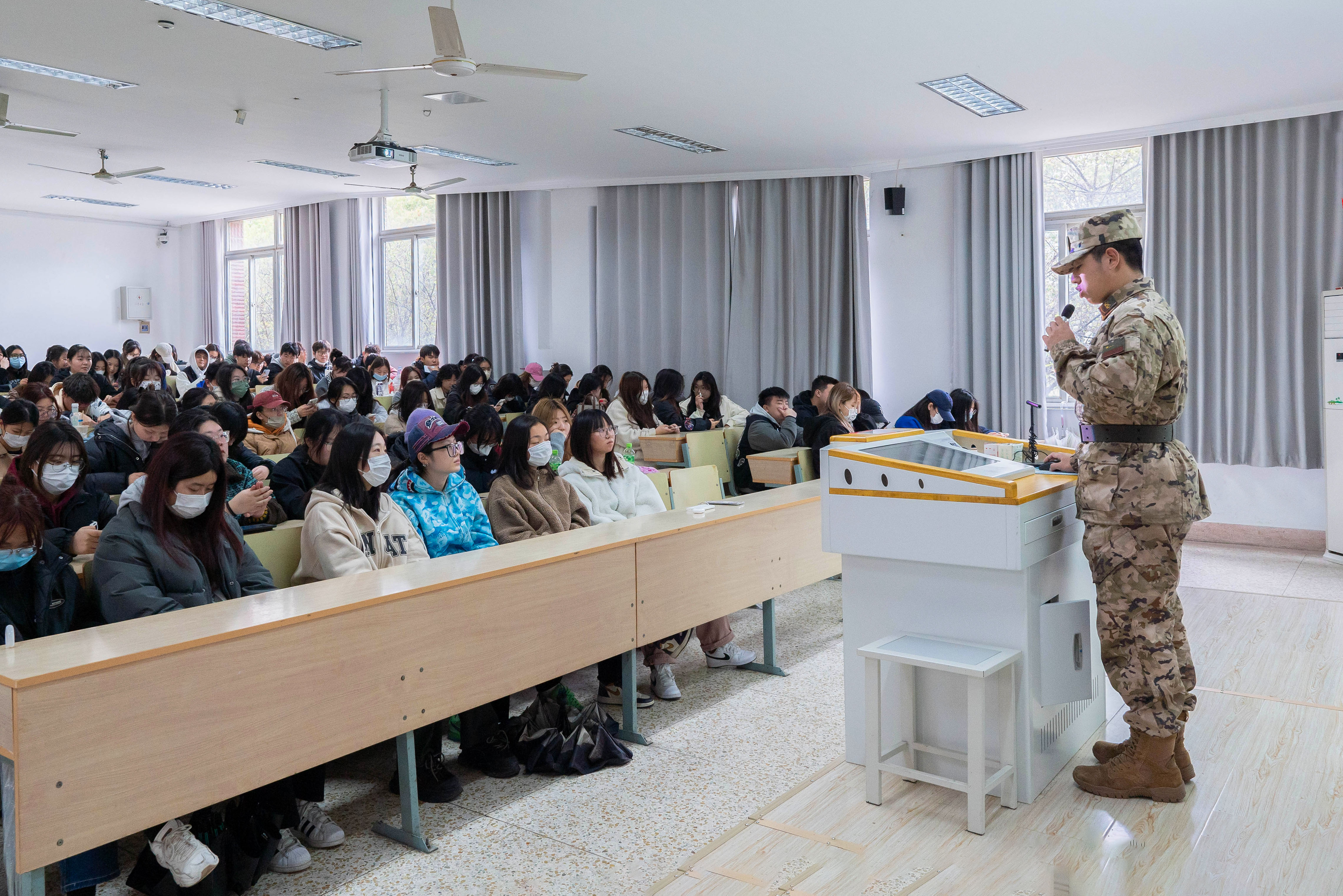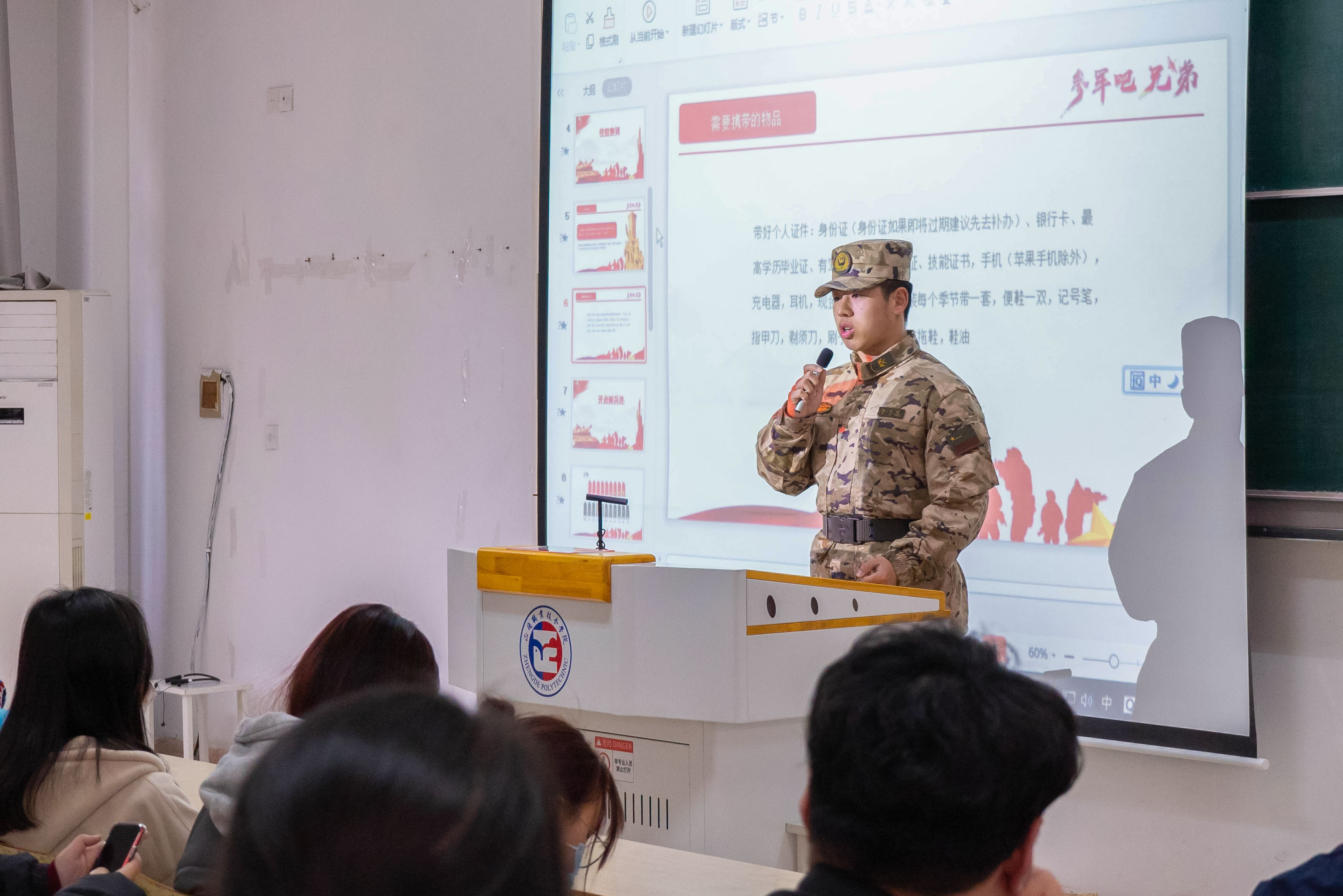 “退伍不褪色”,4月24日中午,艺术设计与建筑工程系2021级新闻专业鲍刘城同学在1104教室分享了自己的军旅岁月,在校园延续军人风采。