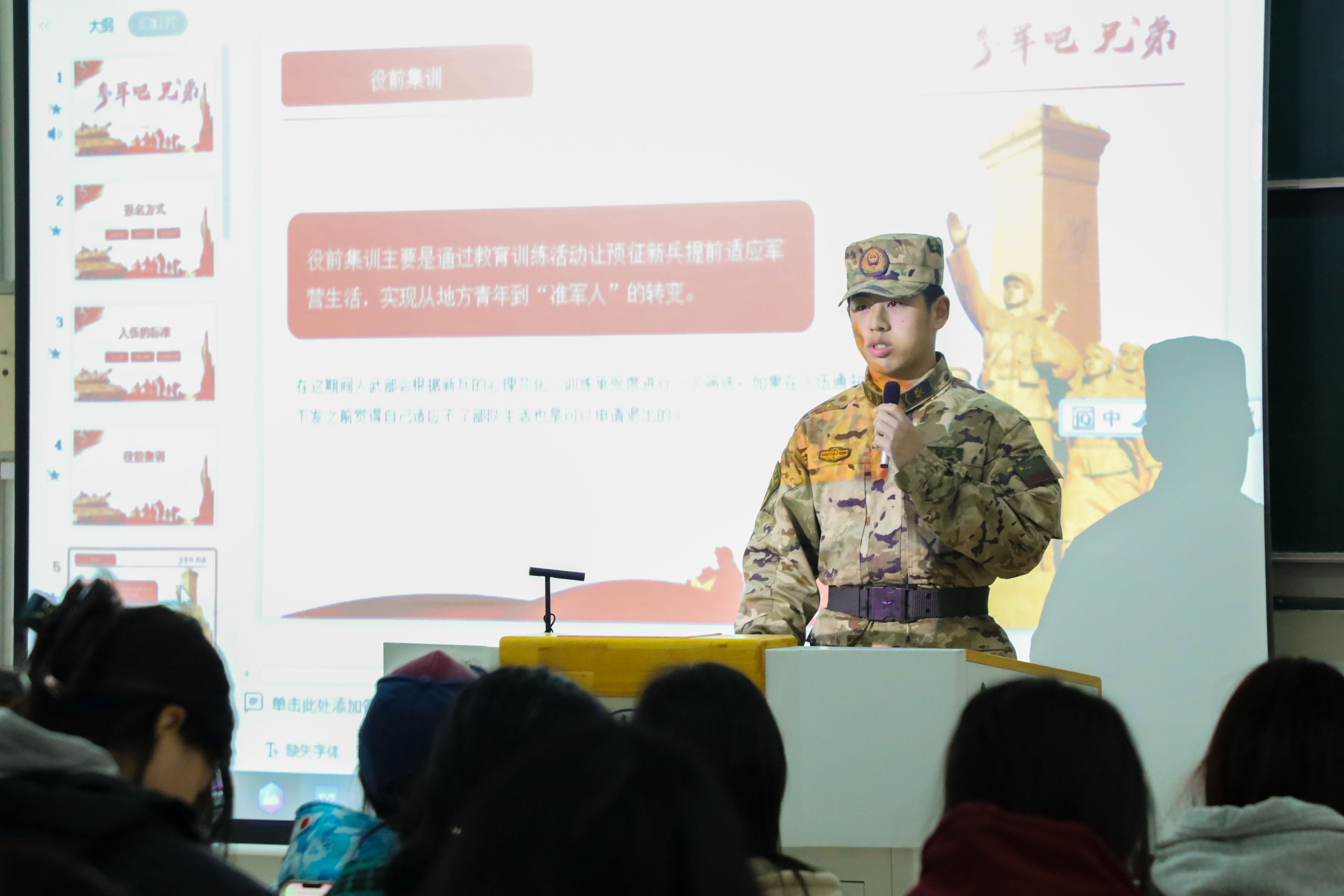 鲍刘城同学从报名方式、入伍的标准、役前集训、开启新兵连、下连生活等方面依次介绍了自己的军营生活。他通过一张张图片为大家描述了退伍时的不舍与留恋,希望学弟学妹们能积极响应国家征兵政策,在军营中锤炼品质、奉献青春。