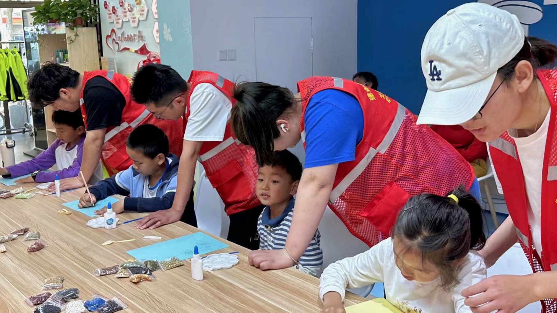 活动伊始,志愿者们先向参与活动的家长、孩子们做身份介绍,介绍本次活动目的、内容及流程等基本信息。接着,给大家提供了卡纸、彩绳、彩色笔、黄豆、绿豆、固体胶、剪刀、油性签字笔等工具后,将爱心贺卡制作流程一一讲解。