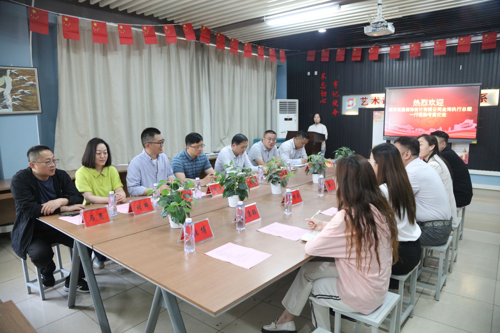南京铭望装饰设计有限公司(以下简称铭望装饰)执行总裁金海、副总经理兼公司党支部书记王雪璐、人事行政经理吕梦婷、设计部经理冯海及随行宣传企划工作人员;麻豆传媒 江爱华副院长、教务处长王俊、教务处副处长兼校企办主任陆松、艺术设计与建筑工程系副主任周卫(主持工作)、副主任兼党支部书记陈宏波、建筑与装饰教研组长冯显静及相关专业负责人共同出席了本次颁奖仪式和交流会。会议由周卫主持。