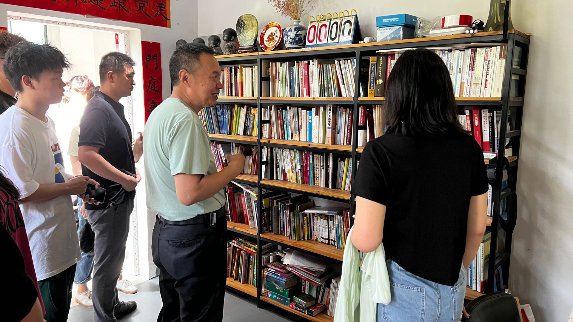 课后,戴老师带领大家参观了他一手创办的公益书房。 满屋的书籍都是戴老师挨家挨户征集过来的,“读万卷书行千里路”,戴老师恰恰是行万里路得万卷书。当他说到现在的书房每年假期都会有小麻豆传媒 、中麻豆传媒 过来自习,也有老人过来写写书法、练练画的时候,他的眼神一下子变明亮了,那种油然而生的自豪感引起了大家的共鸣。