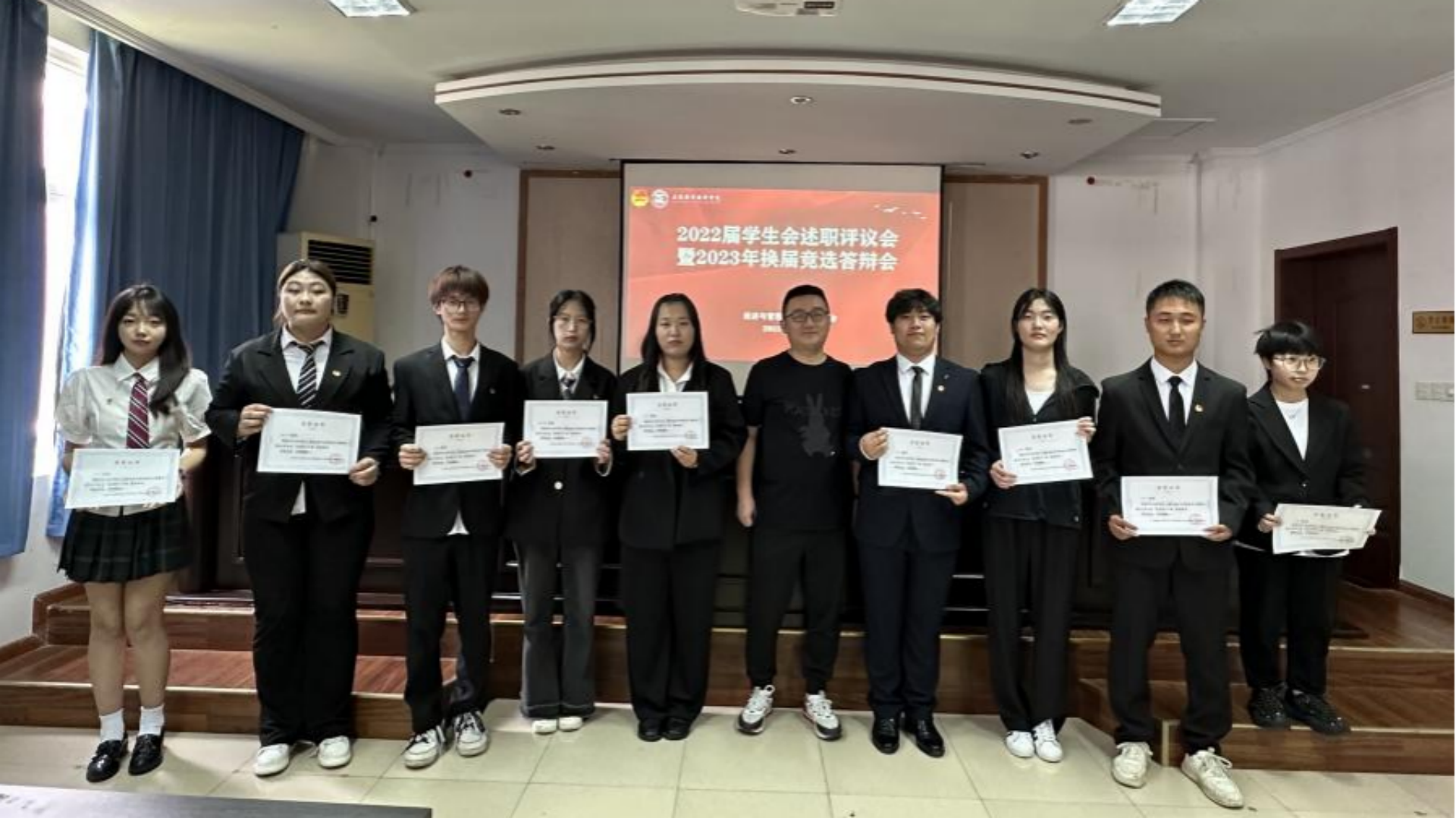 评议人员重点从政治态度、道德品行、学习情况、工作成效、纪律作风等方面,并结合其述职内容进行了客观、全面的评议,最终由辅导员们在现场颁奖。