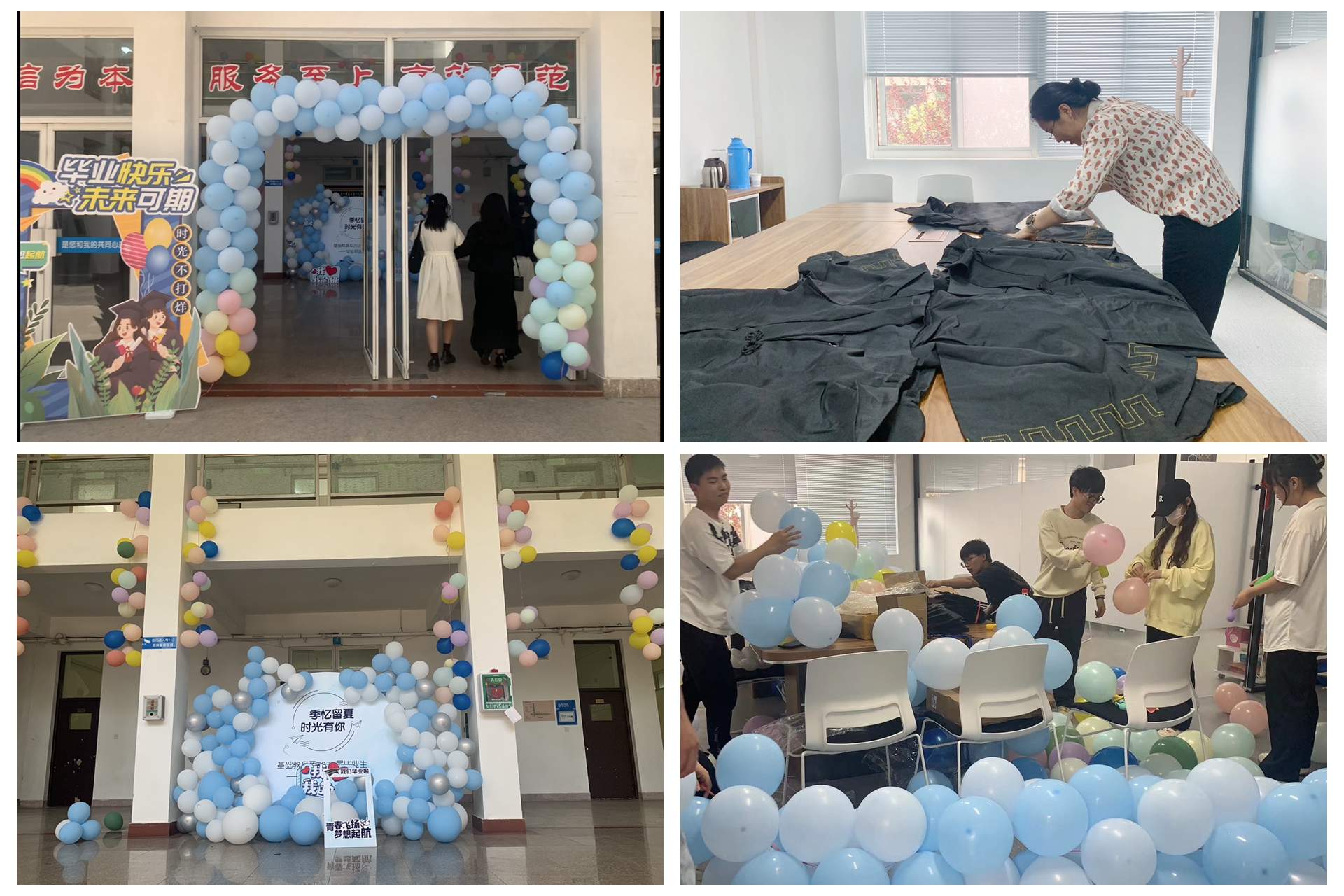 活动的前一天,毕业班的一些班委们提前来到麻豆传媒和大一大二的学弟学妹们开始做欢送会的准备工作,他们把9号楼的大厅进行了精心的布置,辅导员沈言静老师还从家带来熨斗亲自为麻豆传媒 熨烫学士服。