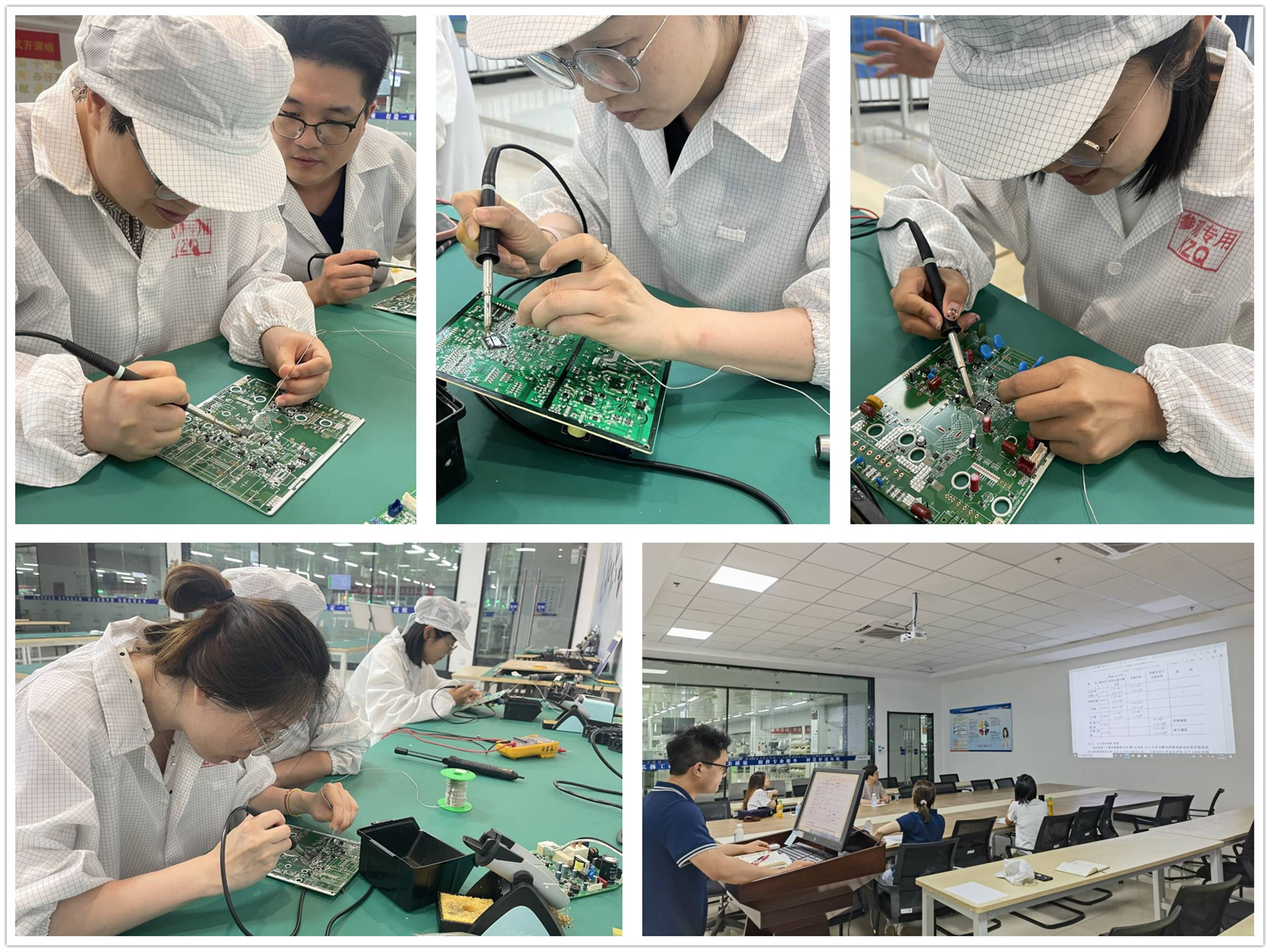 教师技能专项训练分为理论和实践两部分。理论学习中,教师们深入学习了静电防护、接插线工艺以及焊接工艺规范等内容,在生产线上重点观摩产品检测及维修技术,了解电子测量知识点在生产线的实际应用;实践学习中,教师们重点练习了集成芯片的拖焊技术,同时就点焊技术的心得进行交流,此次培训也是校企共建课程《电子测量技术》教学团队的一次深度交流和磨合。