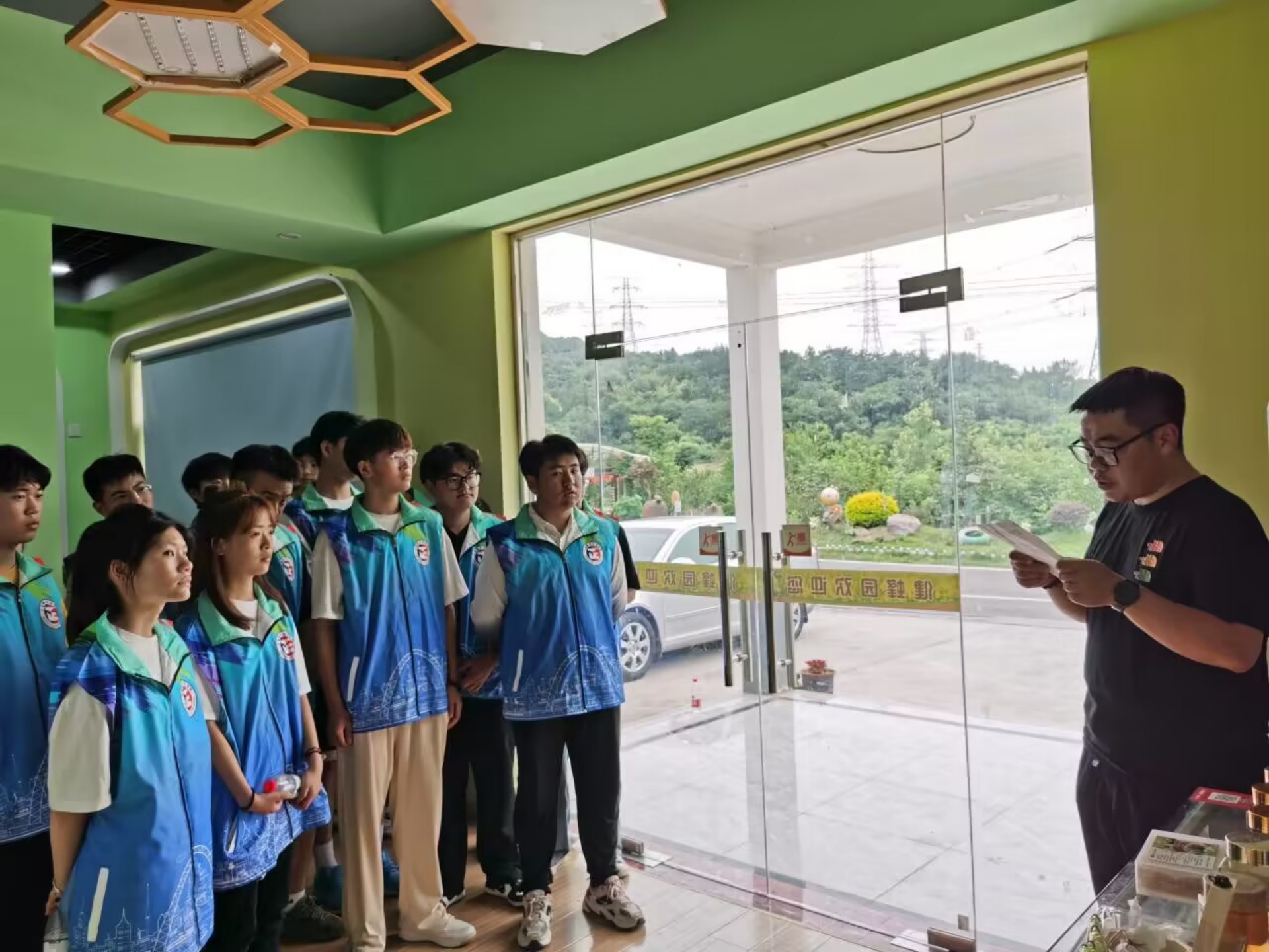 汽车与机电工程系2023届优秀毕业生吴玉鸿同学带领老师们与实践成员们参观了健蜂园的基础设施,同时也详细介绍了当地的发展状况。在蜜蜂科普文化馆里,一条蜜蜂文化长廊展示了数年养蜂历史所积淀成的蜜蜂文化。吴玉鸿同学为大家展示了蜜蜂的分工特点、繁衍方式、养殖技术等一系列相关知识。在大致了解了蜜蜂之后,小队成员们带上养蜂帽,亲身体会养蜂的生活环境,在经历了品尝原味蜂蜜、清理草地等活动后,小队成员们受益良多,切身体会到了新农人在乡村产业经济振兴这条路上的艰辛与不易。