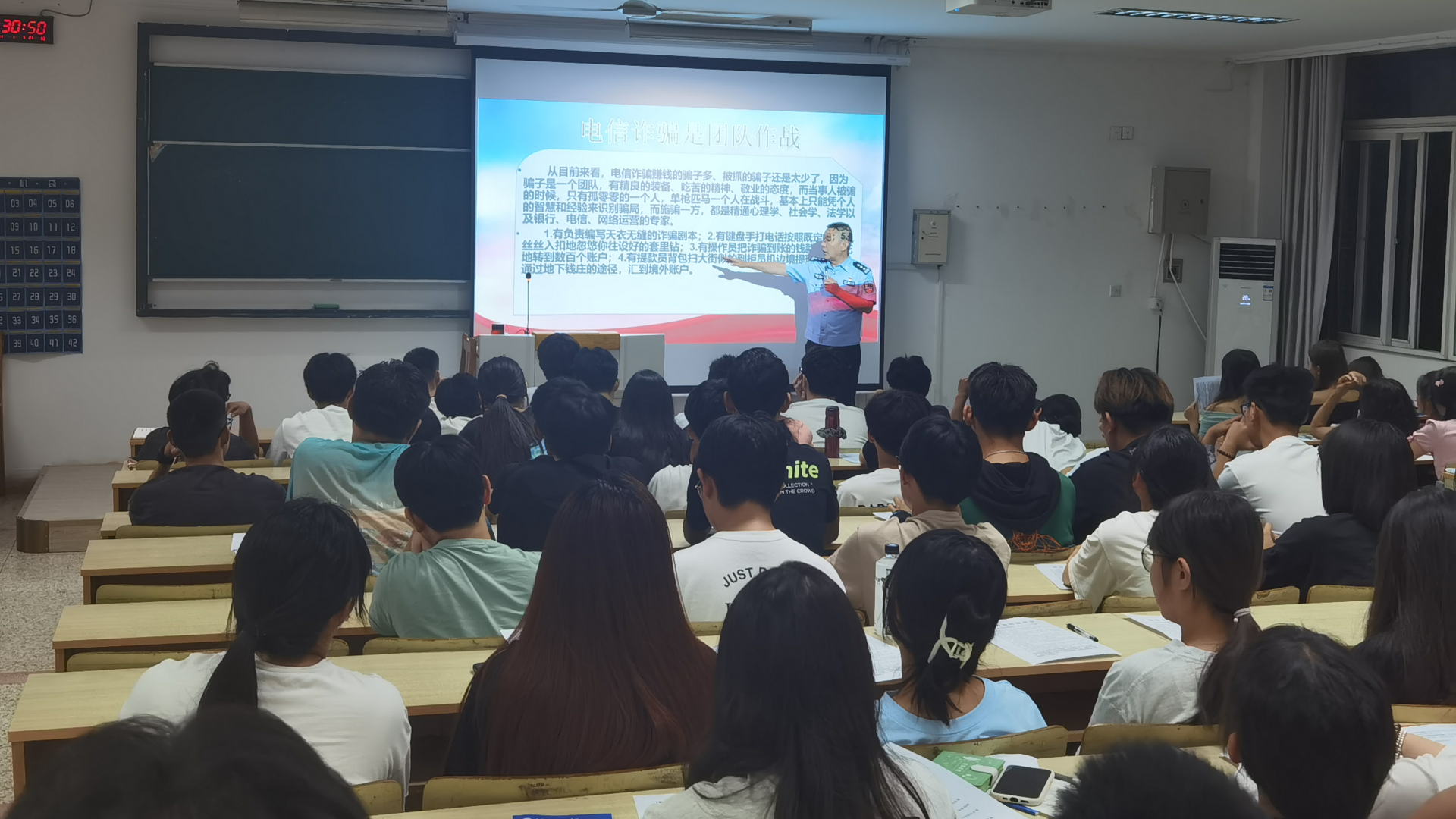 9月11日晚,麻豆传媒 保卫处、麻豆传媒 处牵头,邀请江宁开发区派出所娄军来警官走进麻豆传媒 ,为2023级新生开展开学第一课“反诈宣讲”。民用航空系作为本次活动第一站,全体新生热情高涨,课堂氛围活跃。