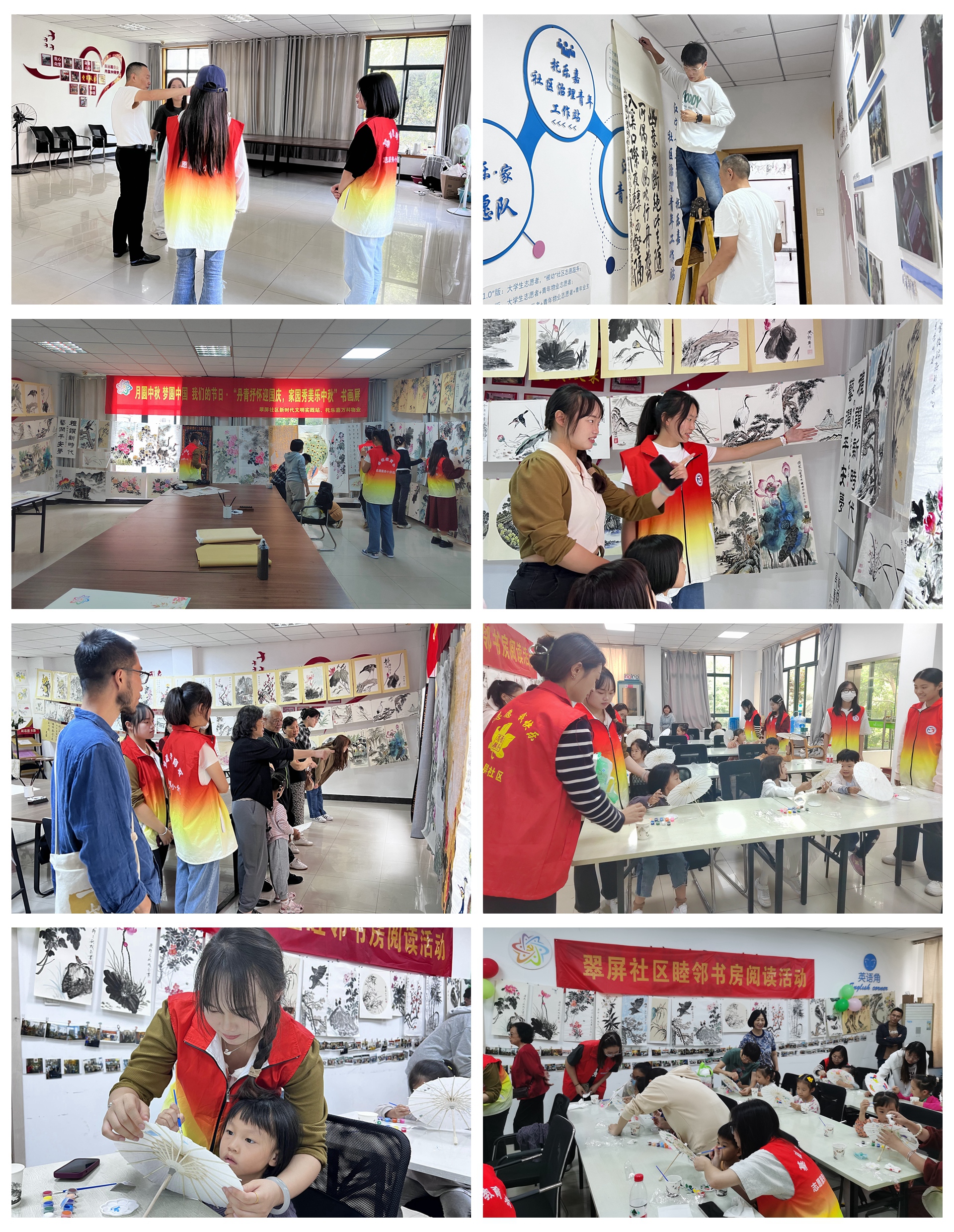 9月19日,基础麻豆传媒-麻豆视频-麻豆性爱 系朱雨晨等志愿者来到社区为书画展活动做准备工作,与社区负责人一同设计活动方案,思考活动流程、规划活动布置。在社区负责人及专业老师的指导下,大家分工明确、互相配合。活动开始,社区的居民们陆续到达现场,大家一起共同赏析作品,一场书画“盛宴”拉开了帷幕。参观结束后,志愿者们带着小朋友们进行书画启蒙涂鸦伞活动。