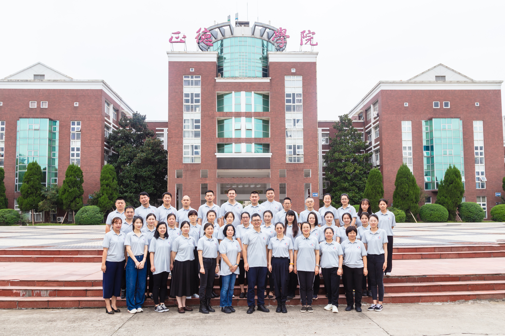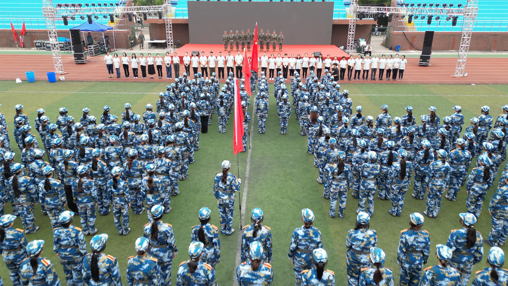 27日中午,结束了一上午辛苦军训的23级全体新生们再次集合,排列出设计好的新队形,全系42位老师们全部来到活动现场与同们站在一起。