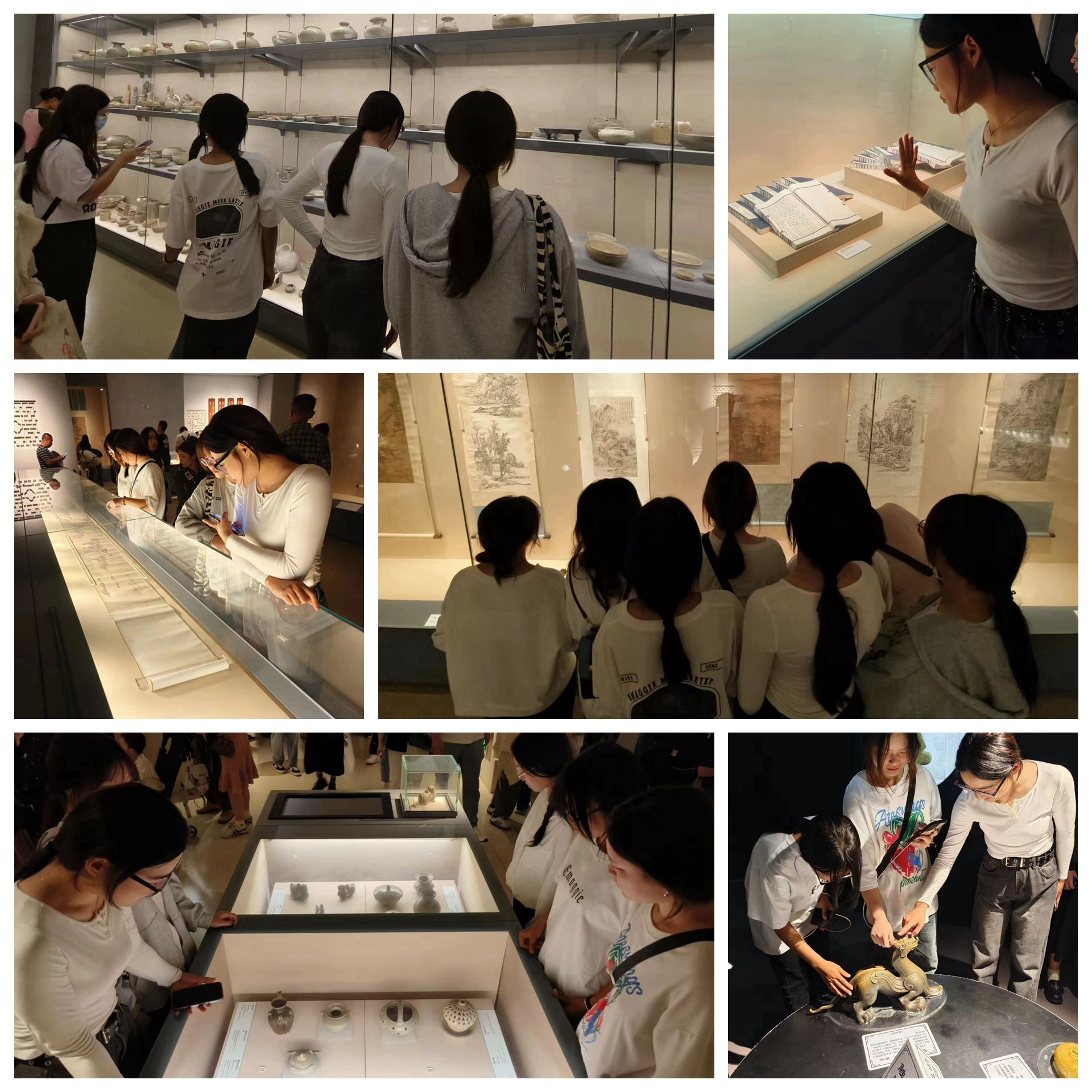 来到展厅,同学们就兴致勃勃地欣赏着馆内陈列的各色展品,精美的字画、精致的首饰织物、雄浑大气的青铜礼器、巧夺天工的青铜编钟、工艺精湛的玉器、瓷器等等,无不展示着中华文明的璀璨夺目。仿佛与他们进行了一次跨时空的对话。感受着中华文明的历史脉动,静静感悟文物背后的故事。