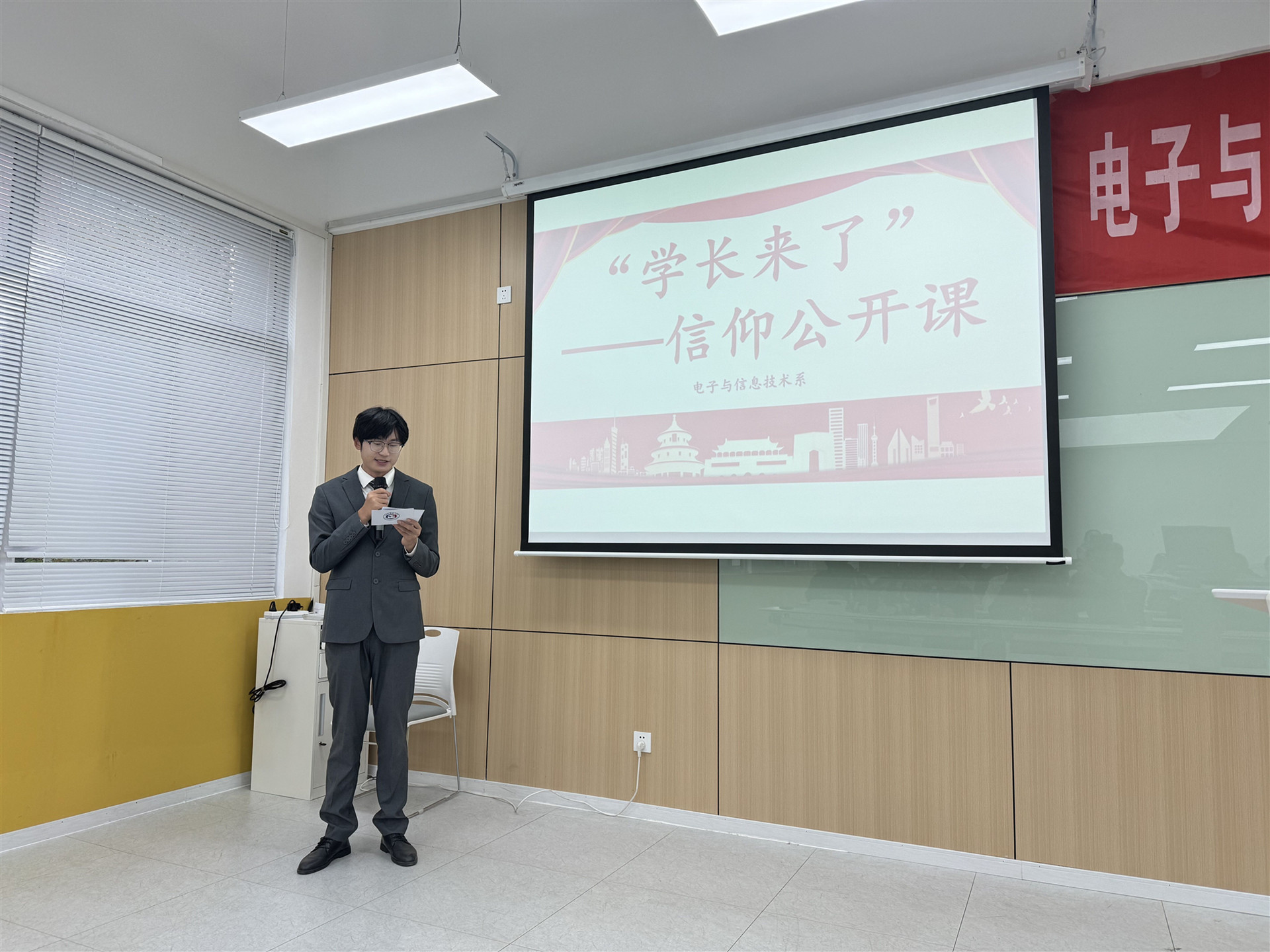 本次信仰公开课采用线上直播与线下会场相结合的方式进行,主会场设在教学楼9205,分会场设置在麻豆传媒 企业微信APP并开启全程直播。为充分发挥优秀麻豆传媒 骨干及青年党员的榜样引领和先锋模范作用,活动邀请了电子与信息技术系2015届团总支副书记陆靖宇、系麻豆传媒 会执行主席曹凯雷,2021届系麻豆传媒 会执行主席殷筱雯参加。