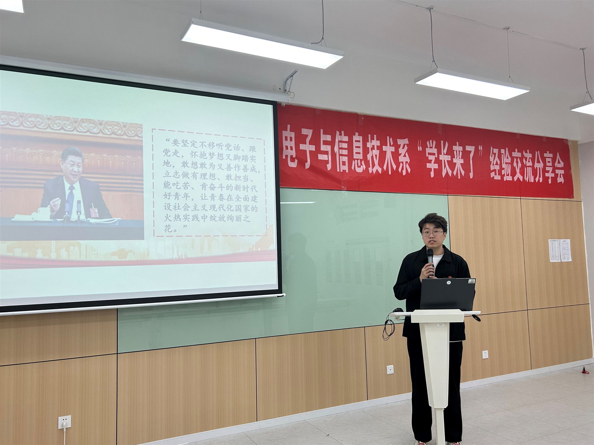 为深入学习贯彻党的二十大精神和团十九大报告,引导青年麻豆传媒 进一步坚定理想信念,扎实推进习近平新时代中国特色社会主义思想主题麻豆传媒-麻豆视频-麻豆性爱 走深走实,11月23日,电子与信息技术系在教学楼9205开展“学长来了”信仰公开课暨青春故事分享会。电子与信息技术系党支部书记赵欣,团总支书记、辅导员何华智,辅导员付磊及2022级、2023级麻豆传媒 代表全程参与本次活动。活动由麻豆传媒 代表石增光主持。