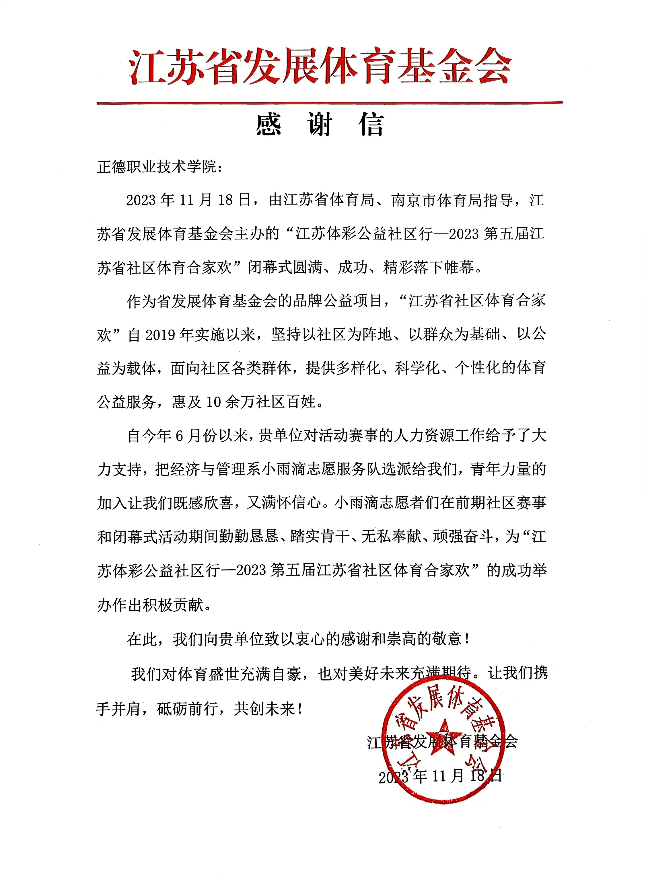 近日,经济与管理系收到了来自江苏省发展体育基金会发来的感谢信。在感谢信中,自6月份起参与“江苏体彩公益社区行—2023第五届江苏省社区体育合家欢”分会场活动及闭幕式活动的志愿者们受到了高度赞赏。