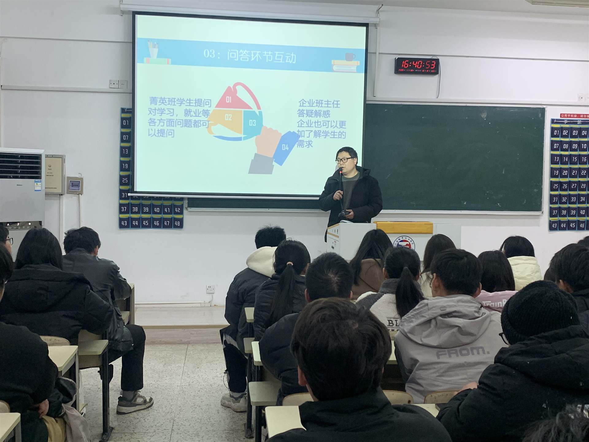 2023年11月30日下午,电子与信息技术系在教学楼2205成功举办计算机菁英班交流会。本次交流会旨在落实立德树人根本任务,优化人才培养方案,推进校企合作深层发展,提高麻豆传媒 的创新能力与实践能力。南京竹影数字科技有限公司总经理范玉峰、技术总监于华贵,南京锋云聚信息科技有限公司总经理张林炜应邀参加交流会,电子与信息技术系专任教师张韬、胡磊、陈锦锦、余爱华、苏娜,辅导员王雯等全程陪同交流。交流会由陈锦锦主持。