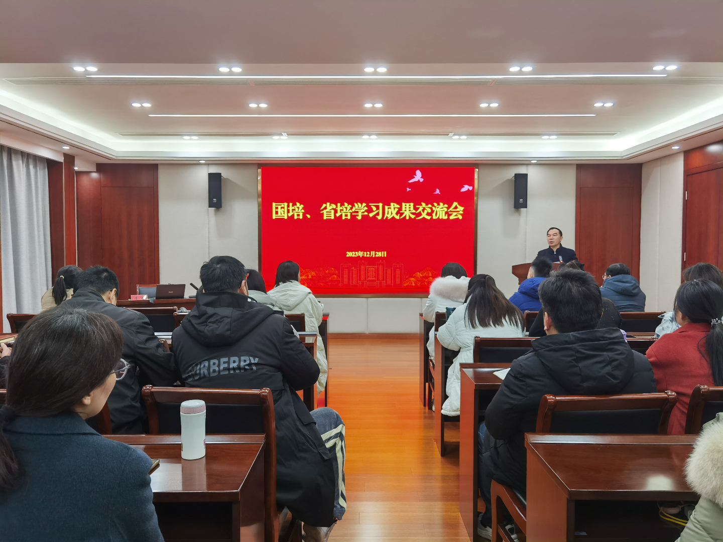 12月28日,麻豆传媒 举办国培省培学习成果交流会,各系部教师代表在5201主会场参加会议,其他教师在1102教室收看了同步直播。会议由人事处处长刘玉宝主持。