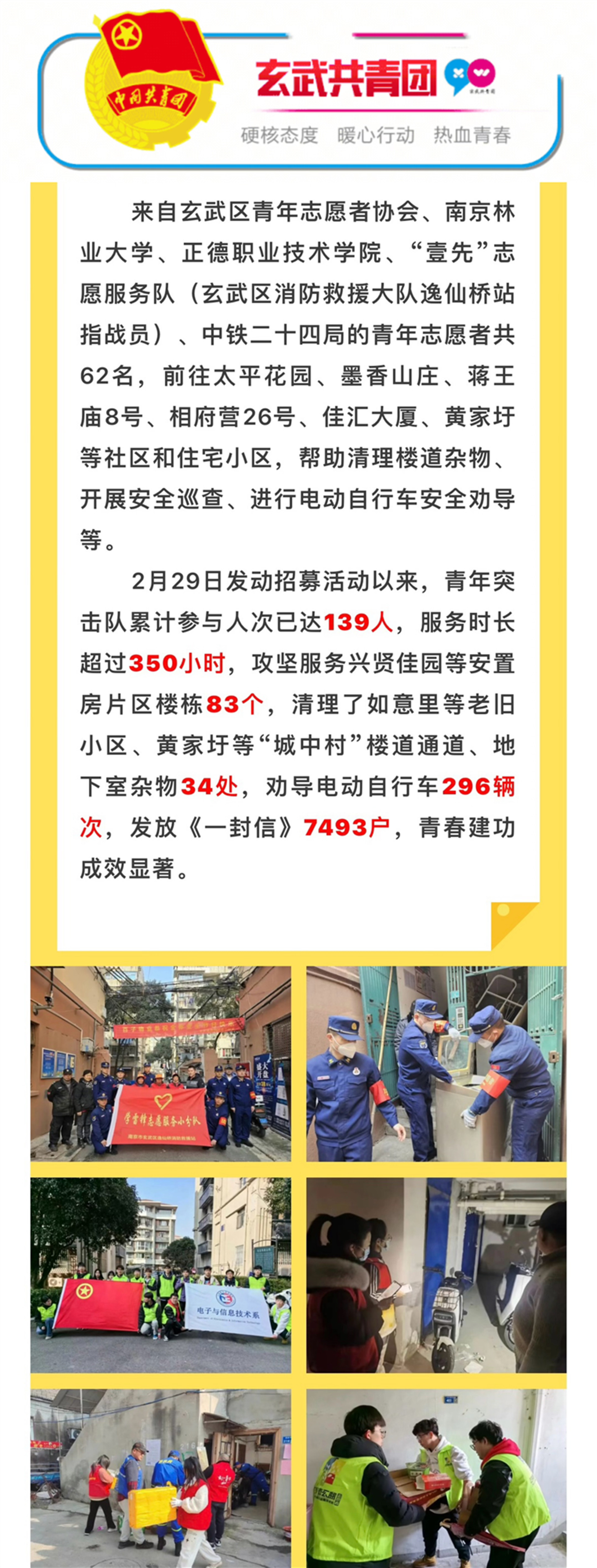 三月春风处处暖,雷锋精神代代传。为进一步弘扬新时代雷锋精神和“奉献、友爱、互助、进步”的志愿精神,2024年3月2日,电子与信息技术系开展“青春志愿行 奉献新时代”学雷锋志愿服务活动,组织麻豆传媒 赴玄武门街道太平花园小区等积极参与“消防安全青年突击队”,深入住宅小区,全面排查火灾隐患,参与集中整治行动,青春建功成效显著,被南京玄武团区委宣传报道。