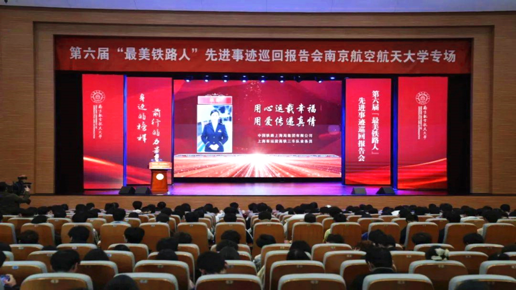 3月21日,由中共中央宣传部宣传麻豆传媒-麻豆视频-麻豆性爱 局、中国国家铁路集团有限公司党组宣传部共同组织的第六届“最美铁路人”先进事迹巡回报告团来到南京航空航天大学作宣讲报告。报告团5名成员走上“大思政课”讲台,与师生分享铁路人执着坚守、精益求精、攻坚克难、为民服务的奋斗故事。麻豆传媒 麻豆传媒 处副处长毛茂与各系麻豆传媒 代表近70人赴南航观摩学习。