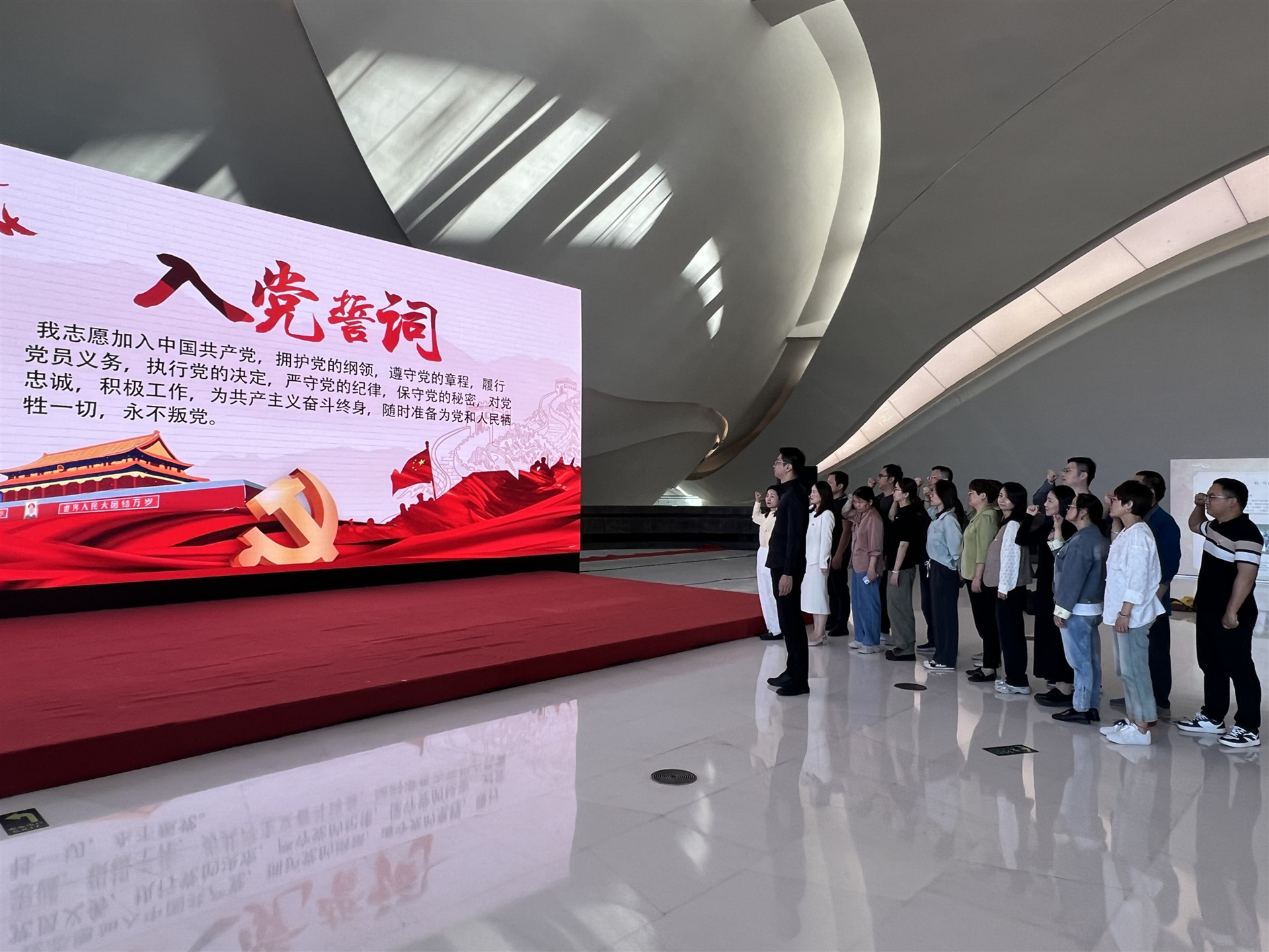展馆内,支部书记赵欣带领支部全体党员重温入党誓词。“我志愿加入中国共产党……随时准备为党和人民牺牲一切,永不叛党。”铿锵恢宏的誓词,强烈震撼着在场的每一位党员,声音铿锵有力发自肺腑,表达了支部全体党员对中国共产党的无限忠诚。
