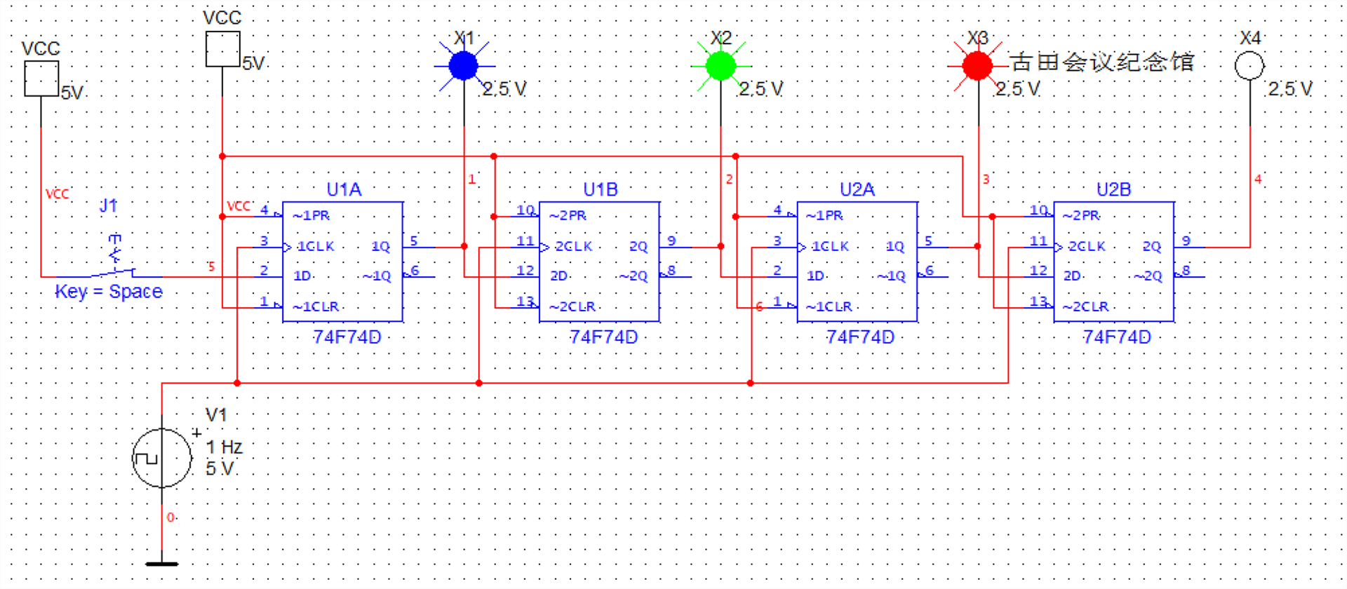 此外,同学们在专任教师的指导下,还基于Multisim仿真软件,构建了一个以数字电子技术中的触发器为核心的仿真电路。他们巧妙地通过移位寄存器的方式,逐步地、完整地记录了“古田会议纪念馆”的信息。这一创新性的设计不仅充分展示了同学们的专业技能,还是利用专业知识传承红色麻豆传媒-麻豆视频-麻豆性爱 的具体展示,真正做到了学以致用,该成果也可以让更多的同学了解红色地标,在锤炼专业技能的同时,引导麻豆传媒 沉浸式地将红色主题内容真正入脑入心。