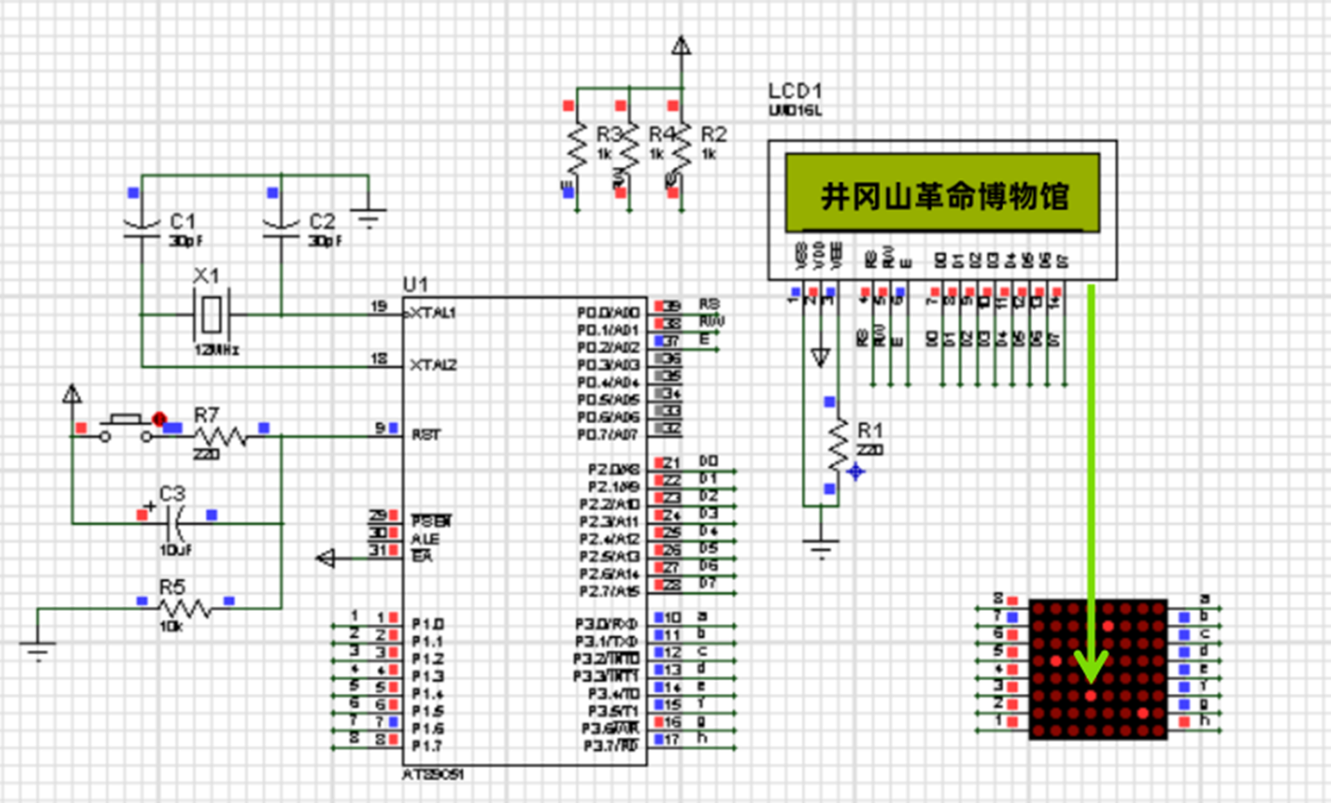 “云打卡”结束后,同学们在专任教师的带领下,充分发挥自身的专业优势,开展了一系列富有创意和实用性的项目制作。针对井冈山革命博物馆,同学们精心设计了一个以单片机为核心的仿真电路。在该电路中,他们巧妙地利用8*8点阵模块,根据各个参观地点的地理坐标,精确地标记了每一个红色地标,能够清晰地显示各个参观点的名称。