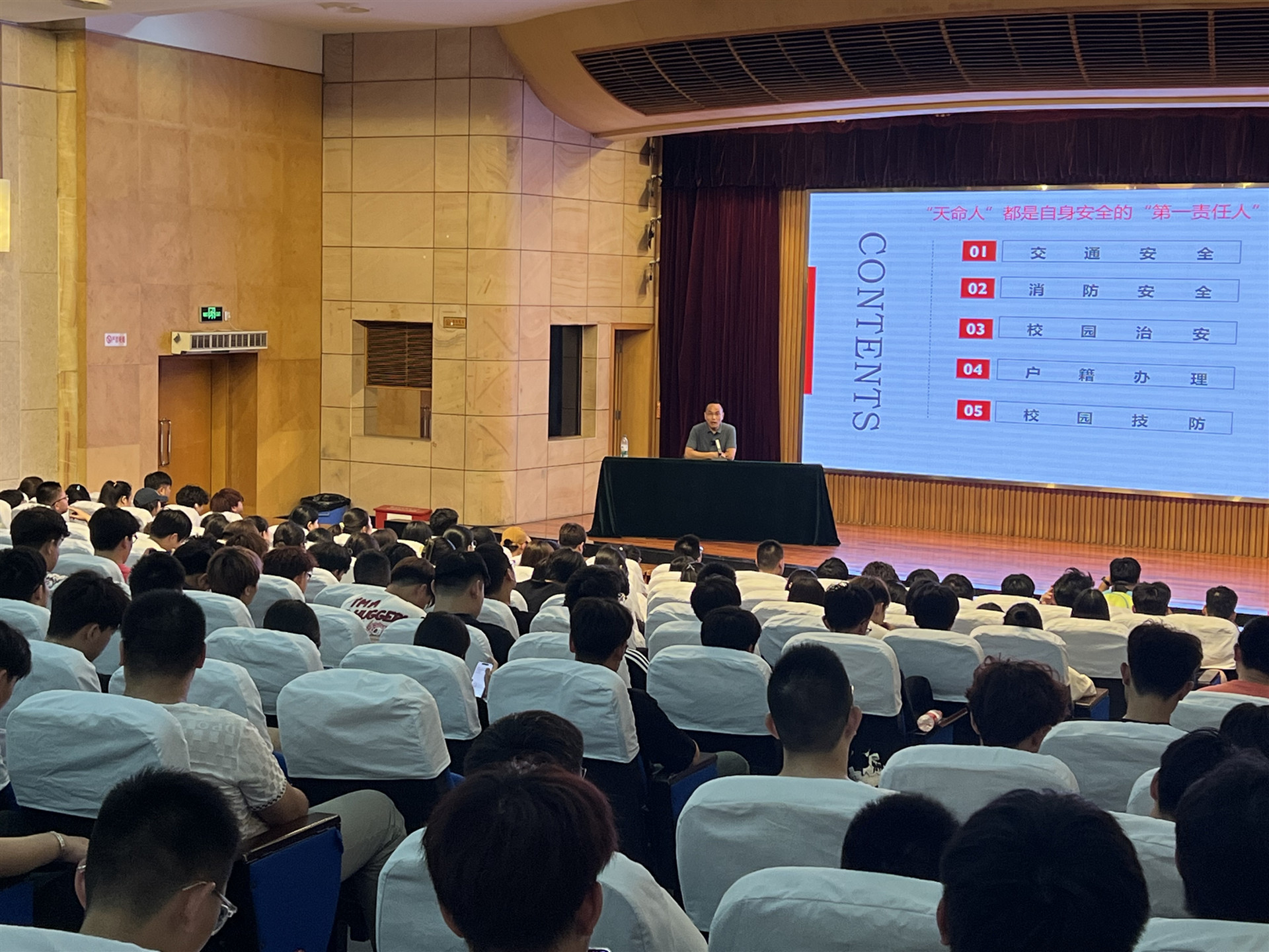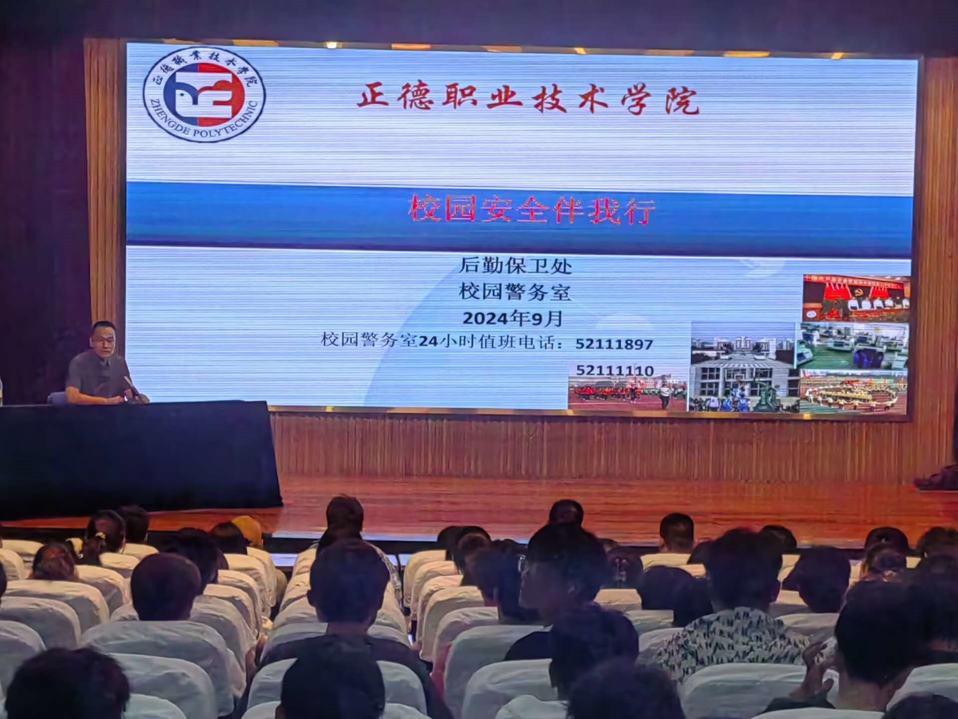 在报告厅,丁胜以其丰富的安全管理和保卫工作经验,从交通安全、消防安全、校园治安、户籍办理、校园技防等多个方面为2024级新生进行详细讲解。在交通安全部分,他提醒新生们要遵守交通规则,注意行人和车辆的安全;在消防安全部分,他讲解了火灾的预防措施和应急疏散知识;在校园治安部分,他强调了校园内的安全规定和防范措施;在户籍办理部分,他介绍了新生户籍迁移的流程和注意事项;在校园技防部分,他介绍了校园内装设的近500个安全监控和进出口完善的人脸识别系统等。