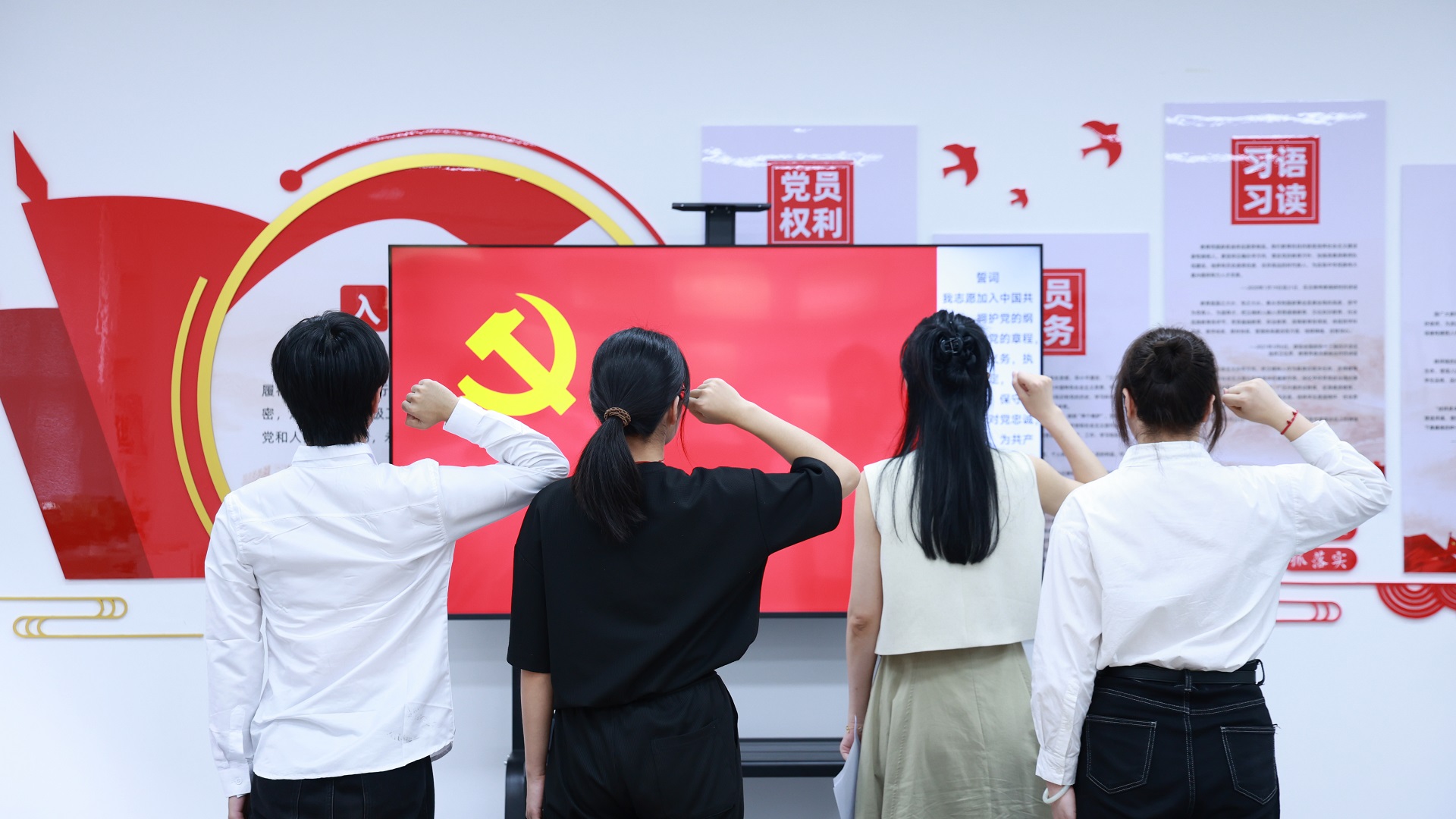 仪式在庄严的《国际歌》声中拉开序幕。杨阳代表系党支部宣读2025年上半年新发展党员名单,入党介绍人为徐婧怡、刘健、鲁皖岭3名新发展党员佩戴党徽。
