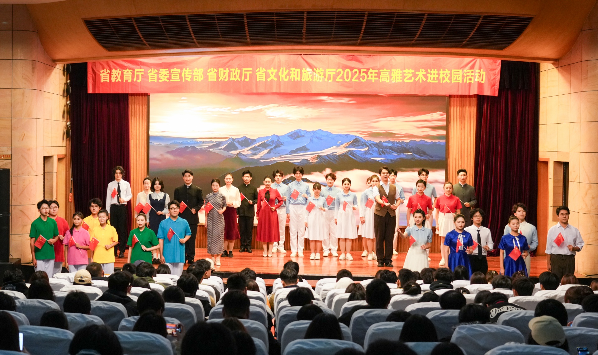 《新的长城》与《铸》以铿锵之力,展现了民族的坚韧与锻造;《西迁》则用远行的足迹,书写下一代人的奉献与担当;《旗袍颜 芳华血》的细腻呈现与《誓言》的庄重承诺相映成趣,展现了特殊年代里个体的坚守与抉择;随后《银杏记得》的温情回忆与《青春的阵线》的昂扬斗志交相辉映,既留住时光的温度,又彰显时代的新声;《可爱的中国》以饱满深情抒发对祖国的赤诚之爱;最后在《青春向祖国报告》的真情告白中,全体演员与观众共同唱响《歌唱祖国》,用最真挚的情感表达对祖国的祝福与承诺,展现了新时代青年砥砺前行的精神风貌。