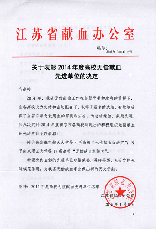 江苏省献血办公室表彰文件
